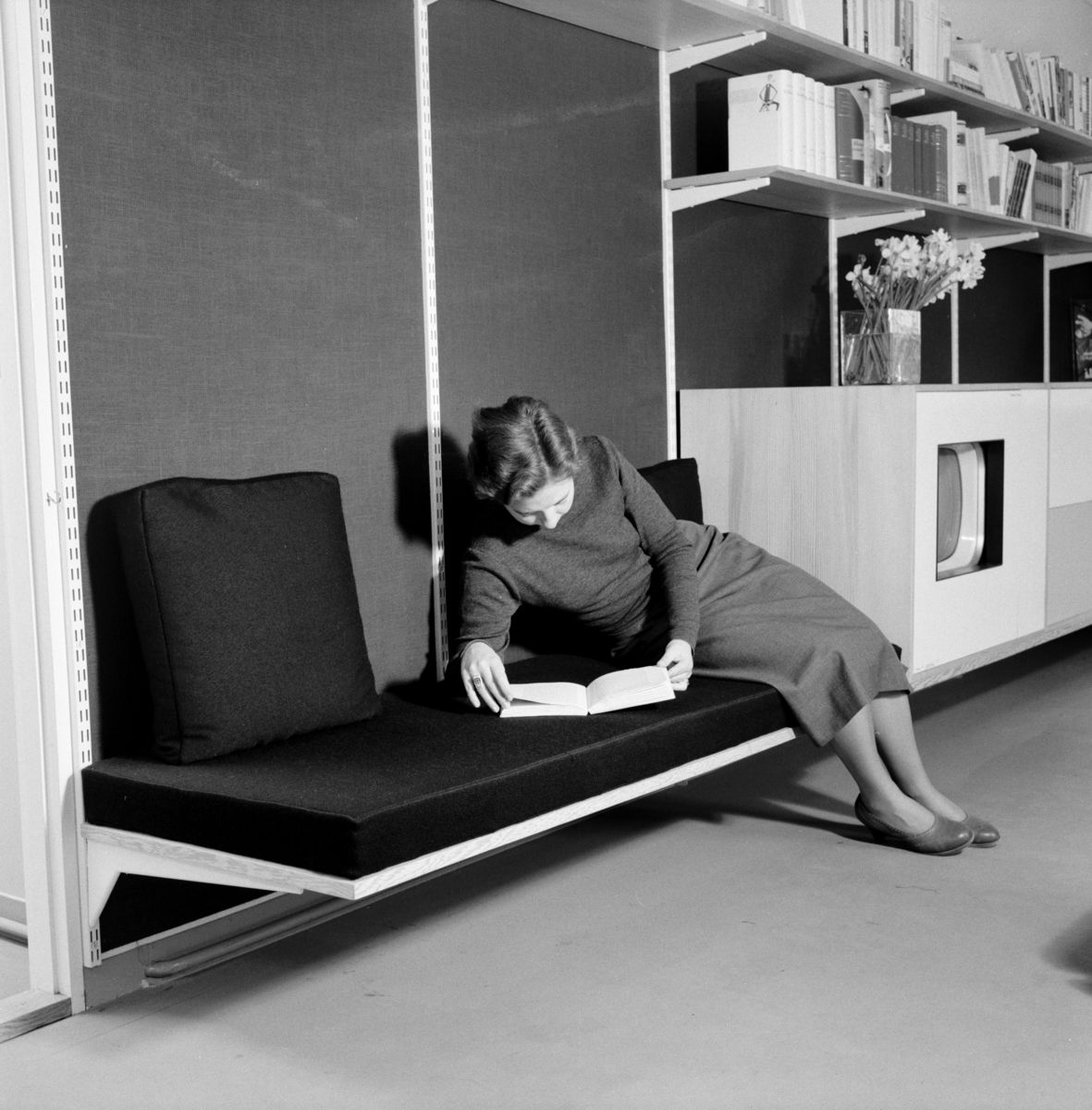 Interiör, väggmonterad soffa och hyllor, kvinna som läser.