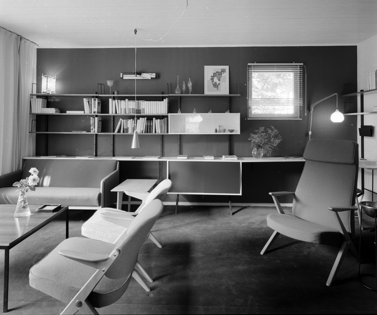 Interiör Hem i Sverige. Vardagsrum, soffgrupp framför bokhylla.