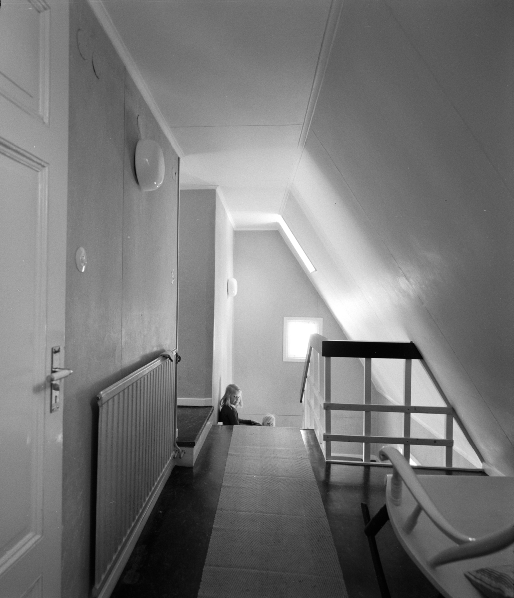 Interiör, övre trapphallen under snedtak med tittgluggar.