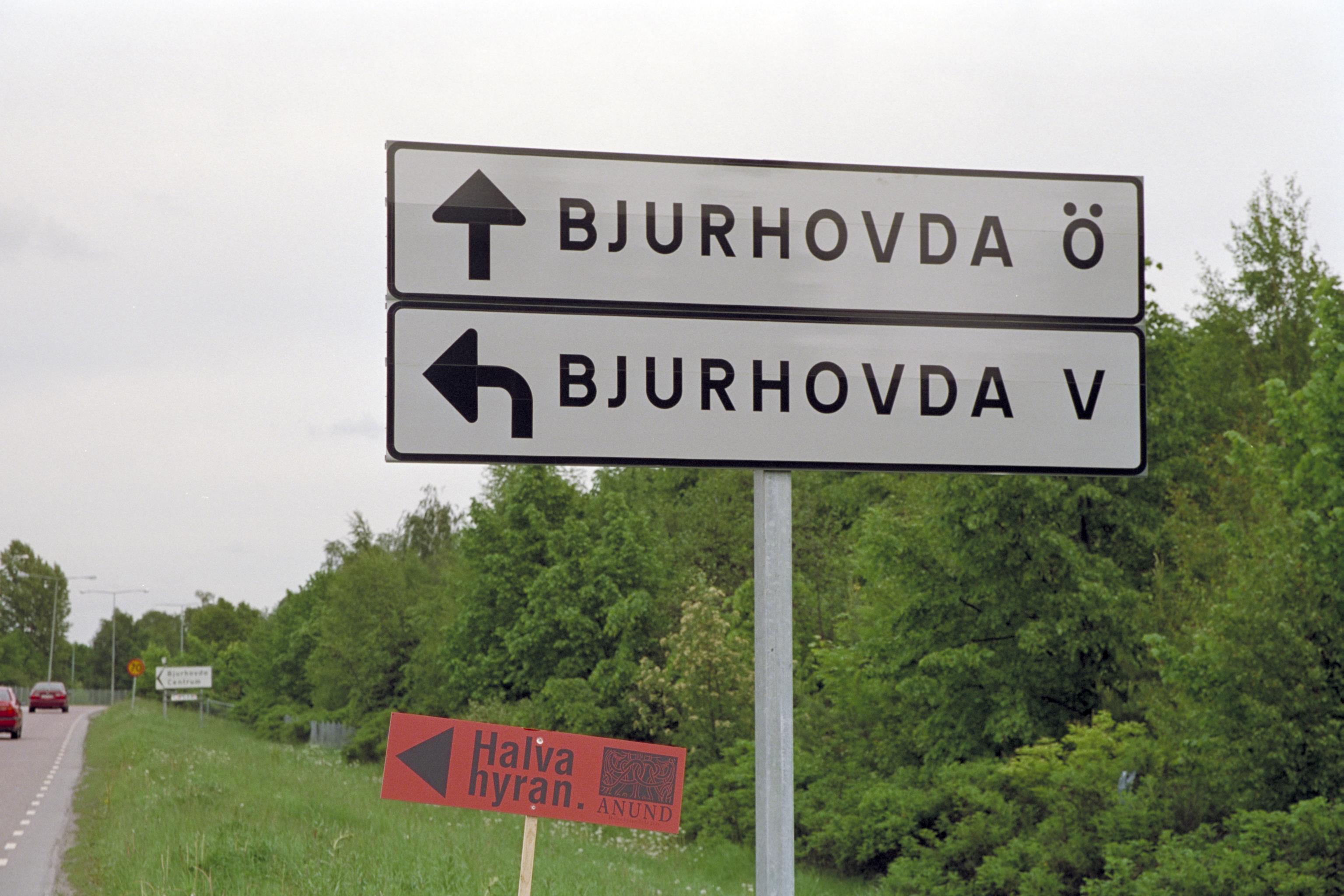 Vägmärke vid Bjurhovda, flerfamiljsområde från 1970-talet.