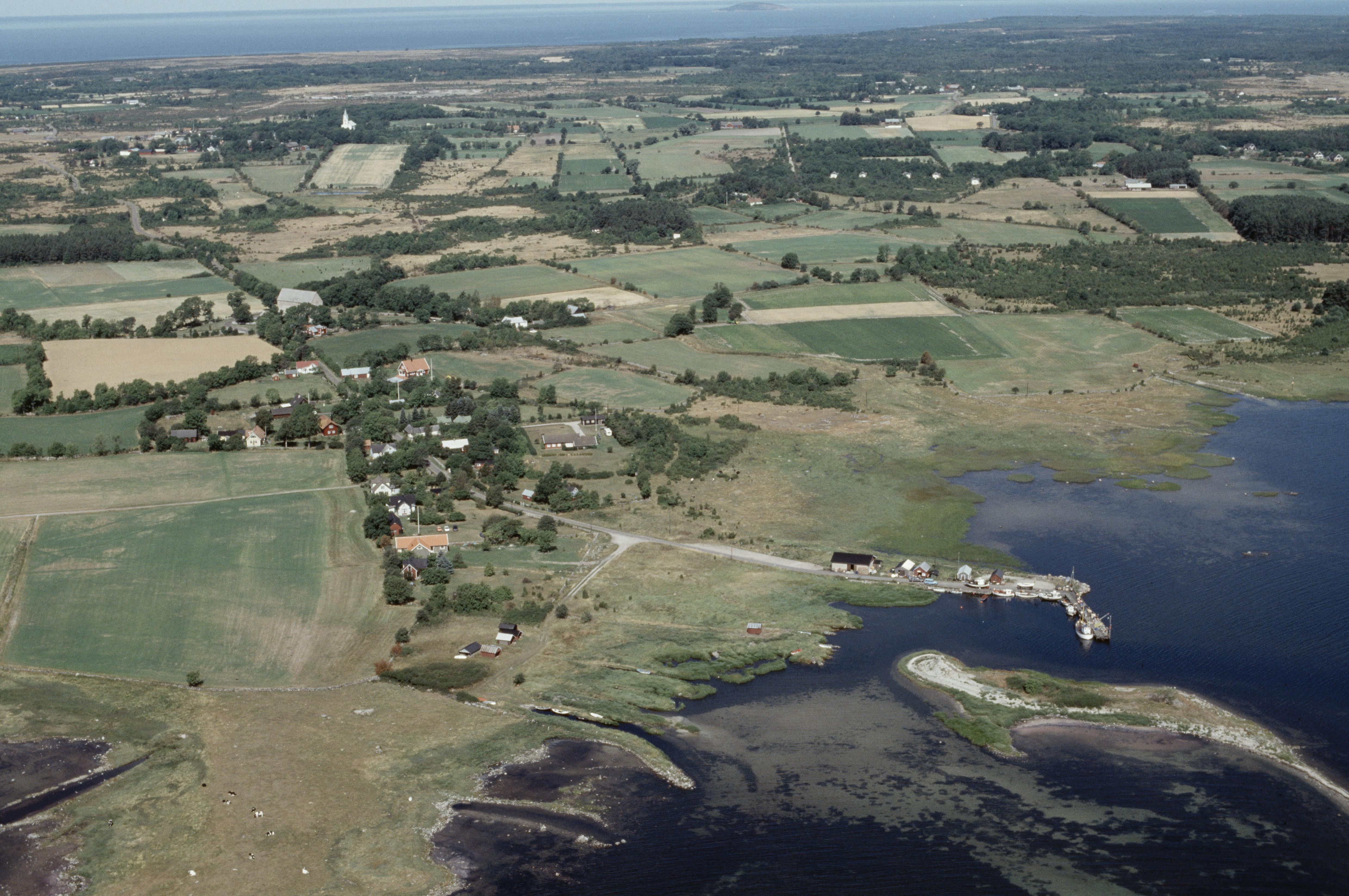 Fiskehamnen Källahamn. I bildens övre del till vänster Källa gamla kyrka. Bilden är tagen mot (väderstreck): NV