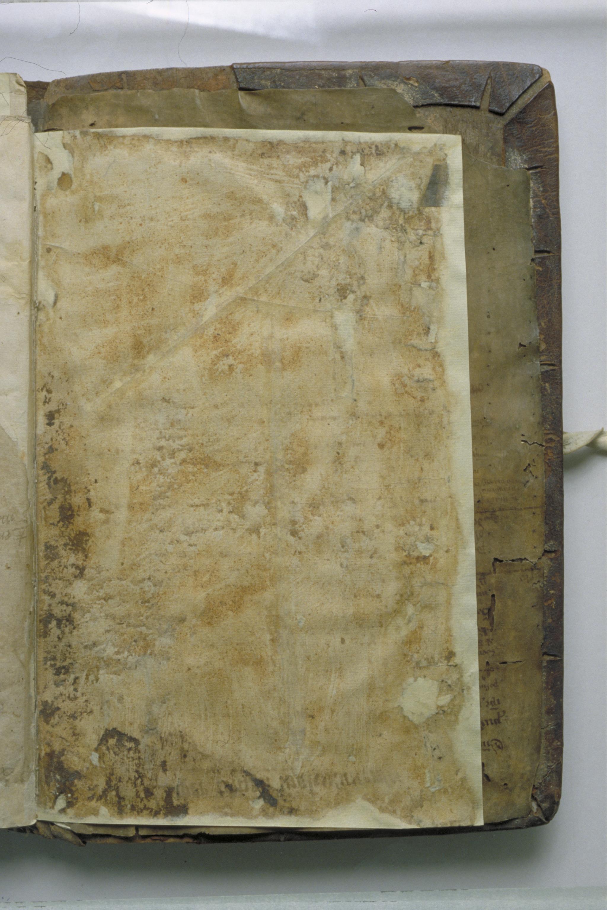 Beskrivning: Handskrift. Bakre pärm, insida.