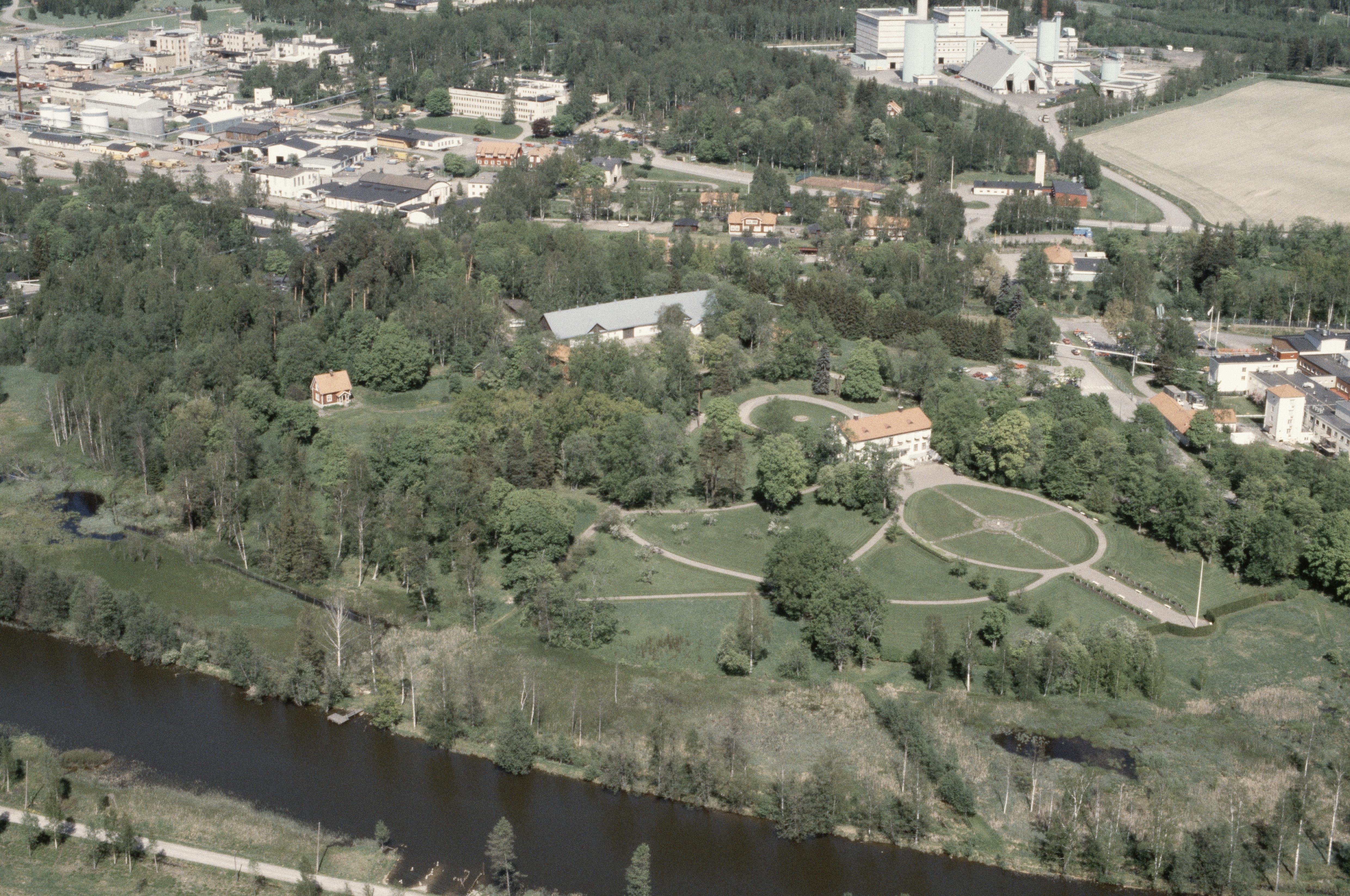 Björkborns herrgård vid Timsälven i Karlskoga tätort. Nere till vänster hamnområde RAÄnr Karlskoga 454. Bilden är tagen mot (väderstreck): NO
