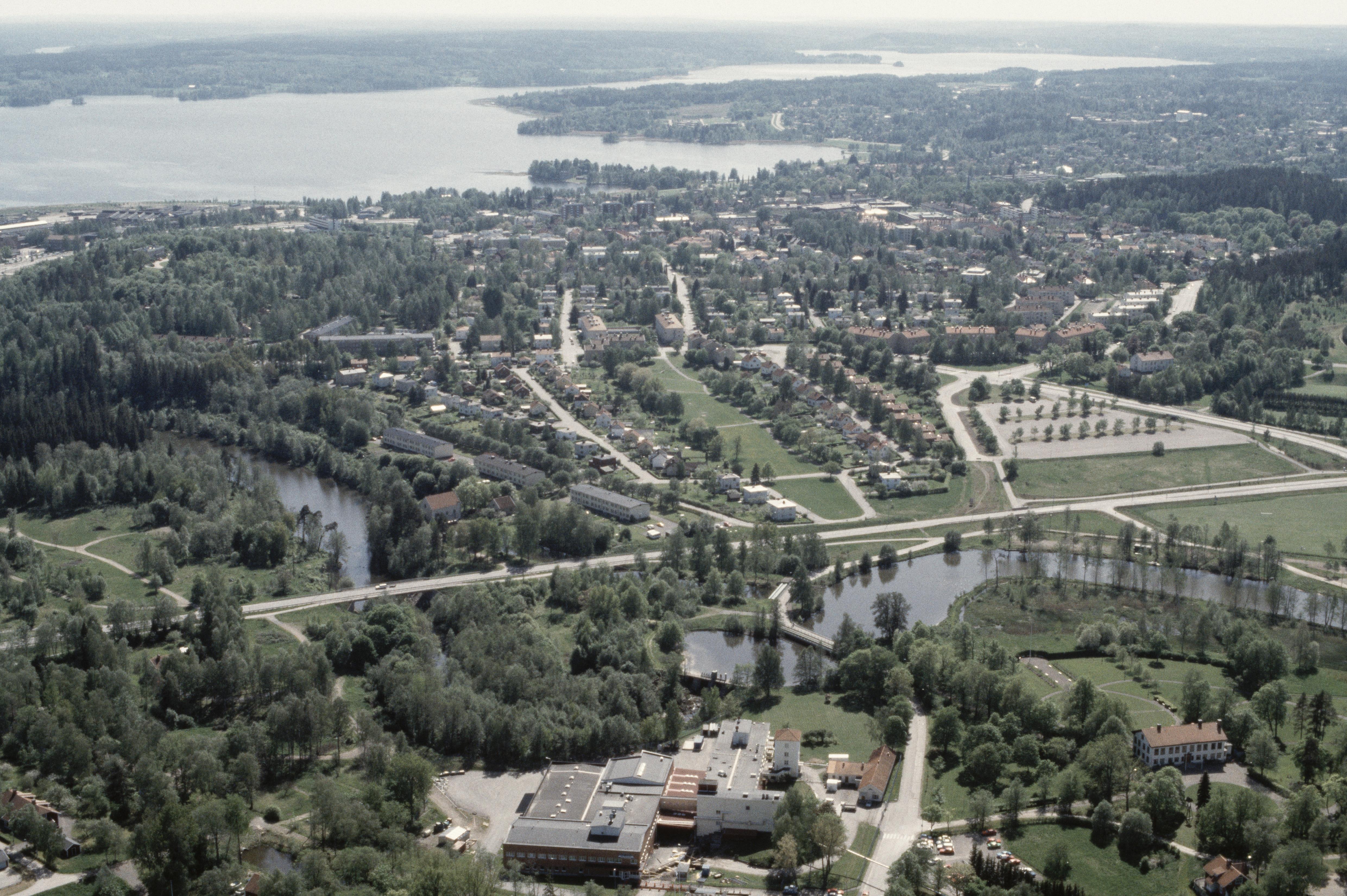 Björkborns herrgård vid Timsälven i Karlskoga tätort. I bildens övre del området Karls-Åby (skrivs även Carls-Åby) i riksintresset T29. Till höger hamnområde RAÄnr Karlskoga 454. Bilden är tagen mot (väderstreck): SSV