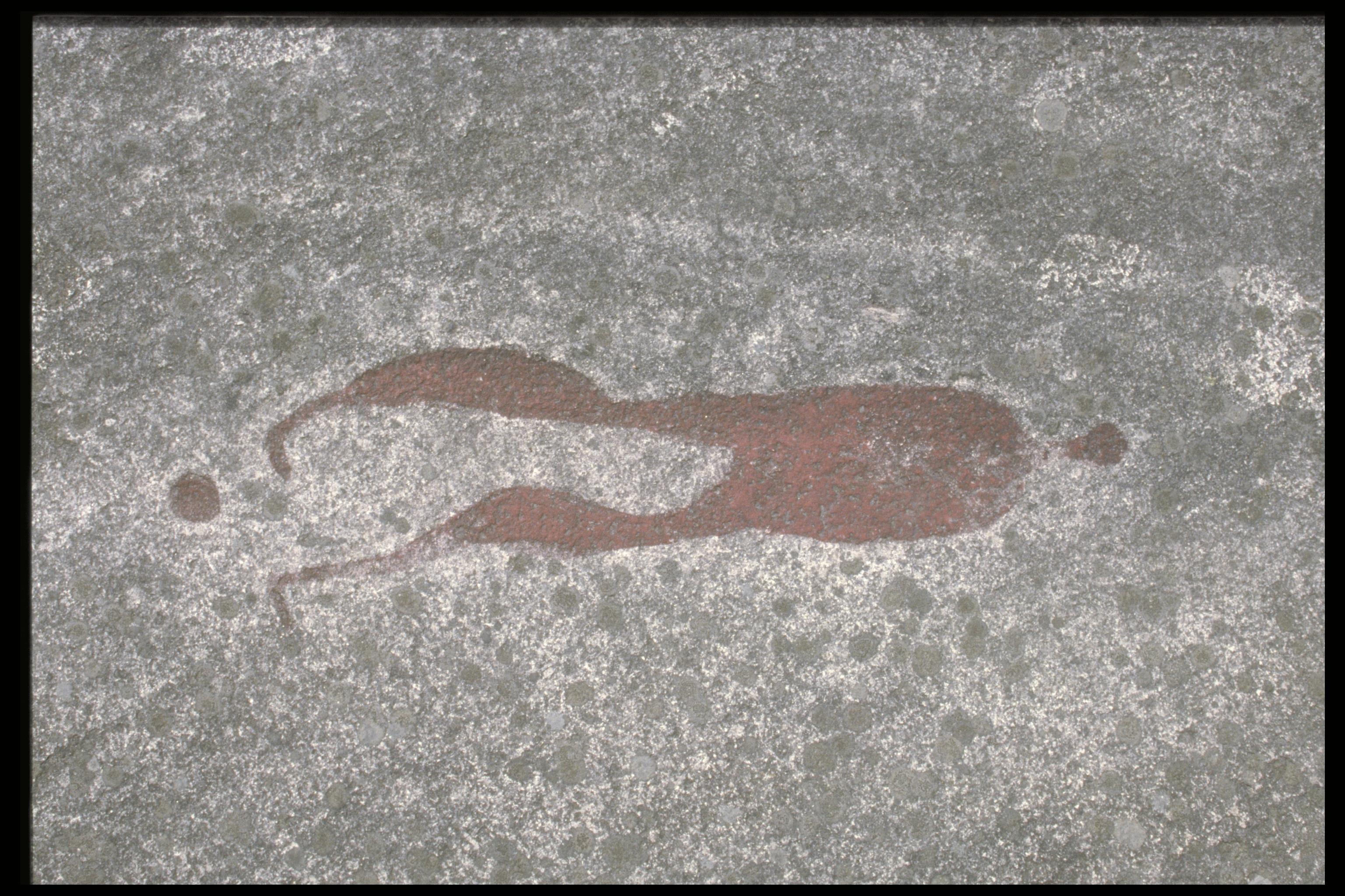 Människofigur med stora vader och en älvkvarn. Lavbevuxen häll. Vitlyckehällen, Tanum 1:1.