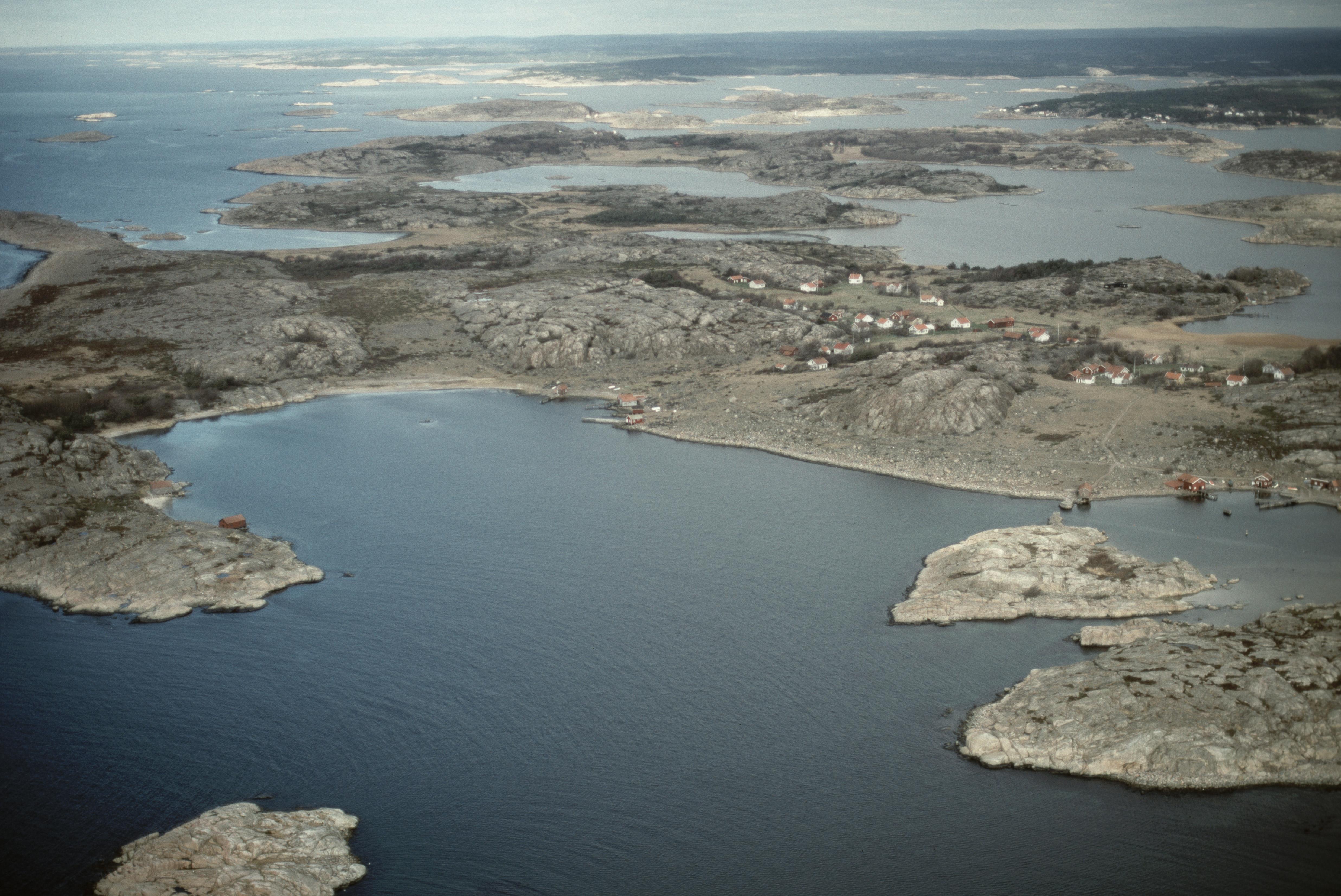 Kosterhavet, östra delen. Kalvön och bytomt RAÄnr Tanum 1643:1 vid bildens mitt. I bildens övre del Lindön. Naturreservatet Kalvö - Lindö - Trossö. Bilden är tagen mot (väderstreck): N