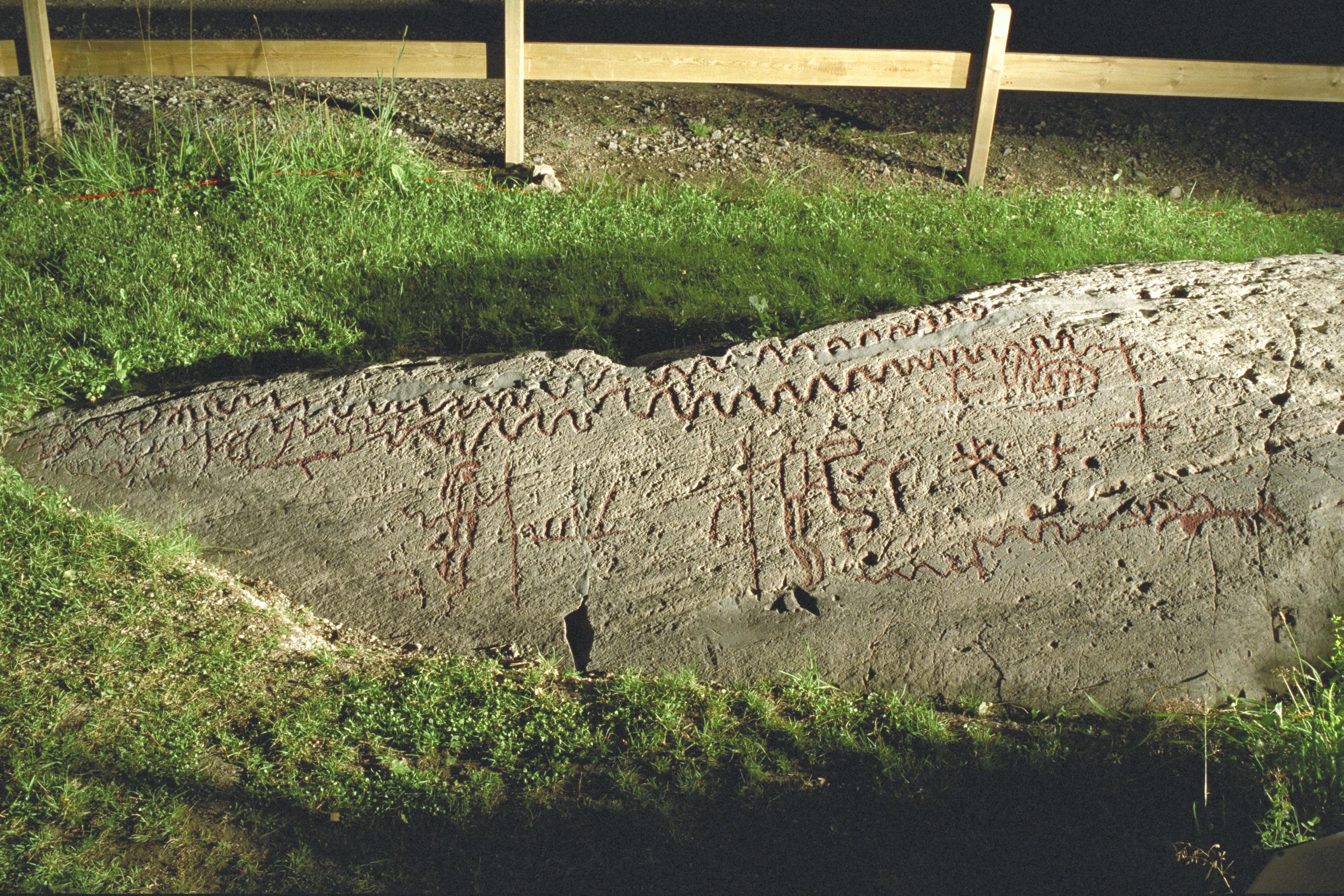 Beskrivning: RAÄ-nummer Tisselskog 10:1. Ormvindlingar och människofigurer.