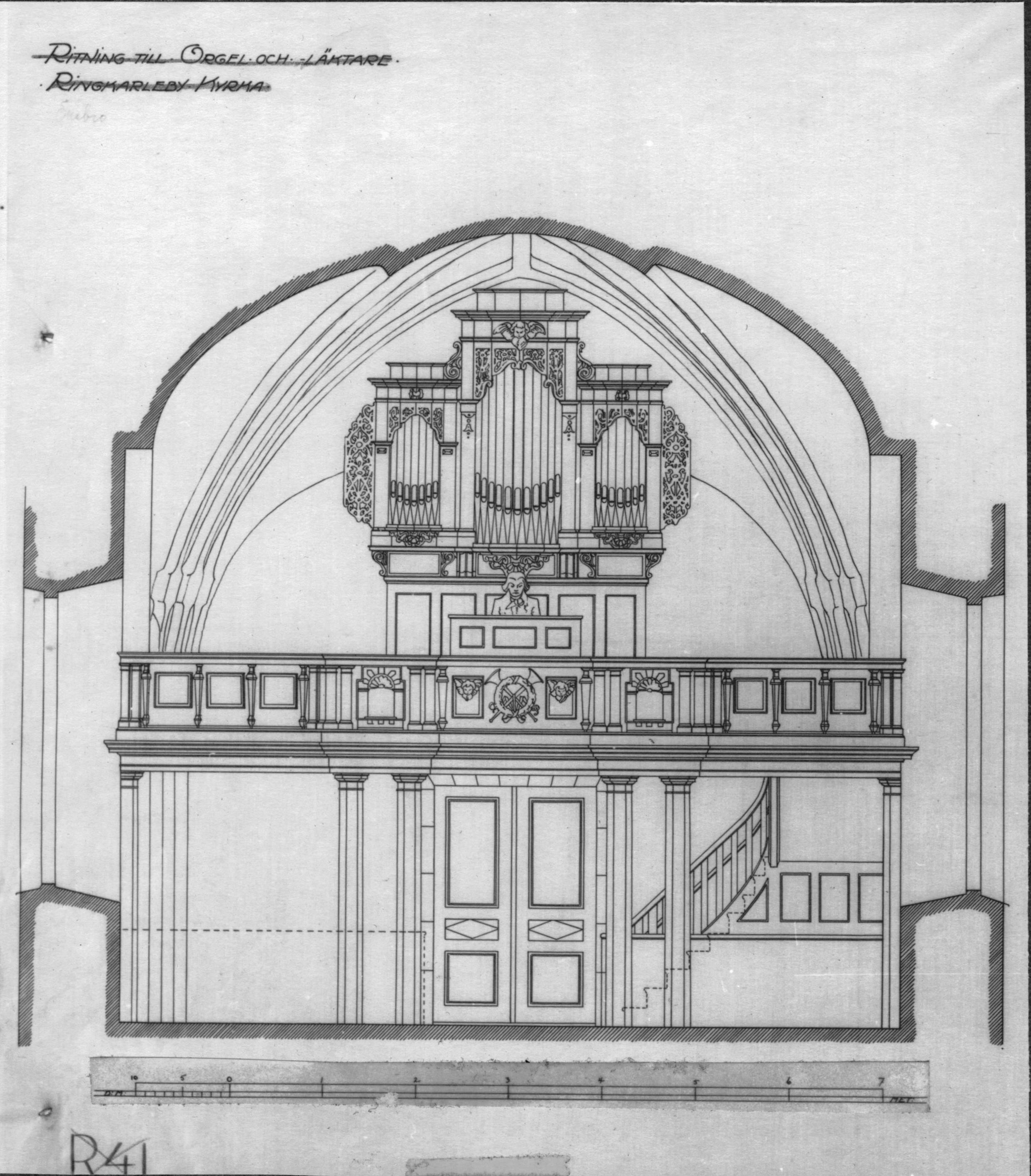 Beskrivning: Foto av ritning av orgelfasad. Ur Kungliga Byggnadsstyrelsens arkiv.