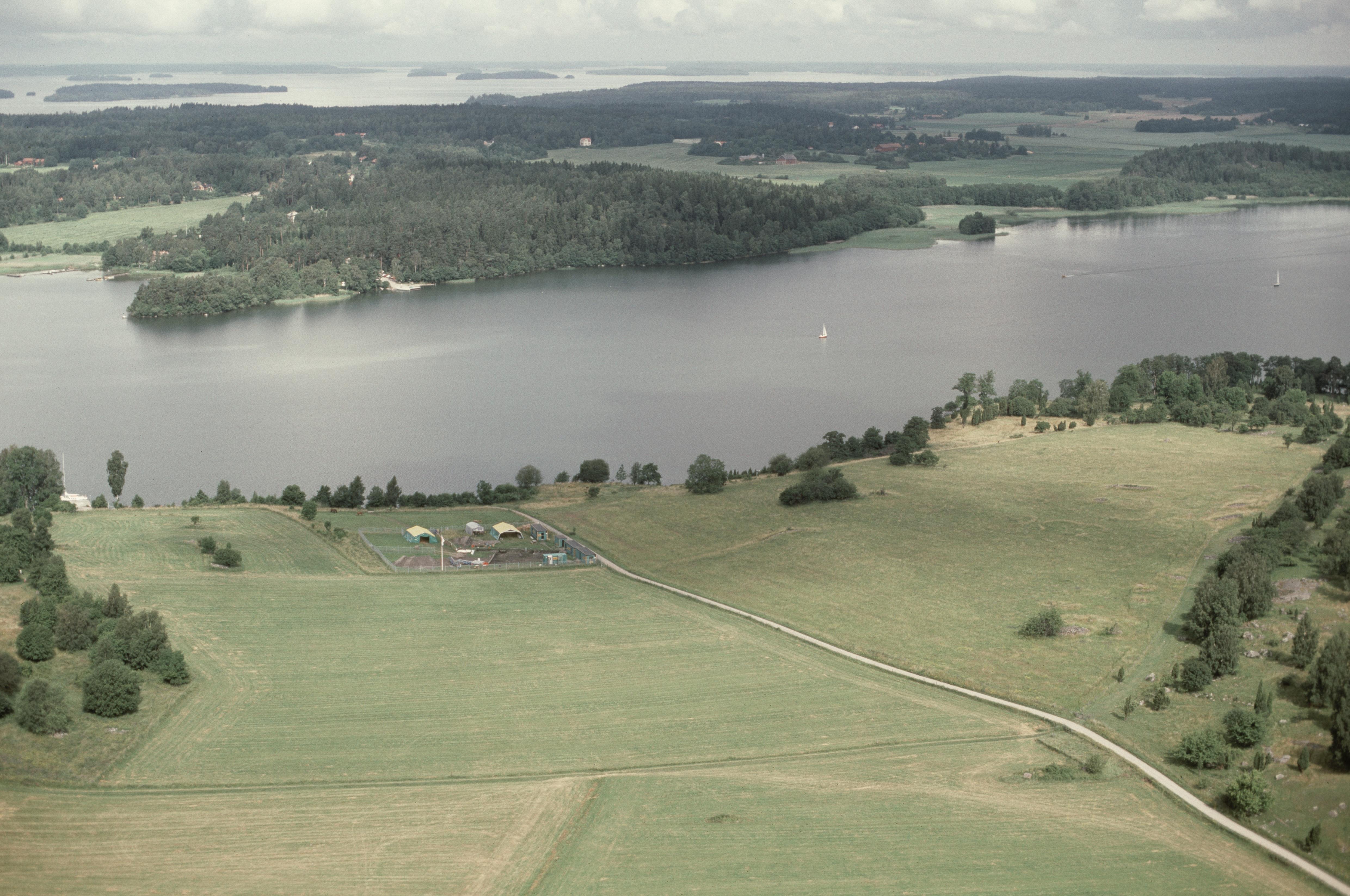 Beskrivning: Fornlämningsområdet Birka på Björkö i Mälaren. Arkeologisk undersökning i norra delen av ön i området Hemlanden och Svarta jorden RAÄnr Adelsö 118:1 vid Stadsvallen Adelsö 119:1-2. Adelsön i bildens övre del. Bilden är tagen mot (väderstreck): NV