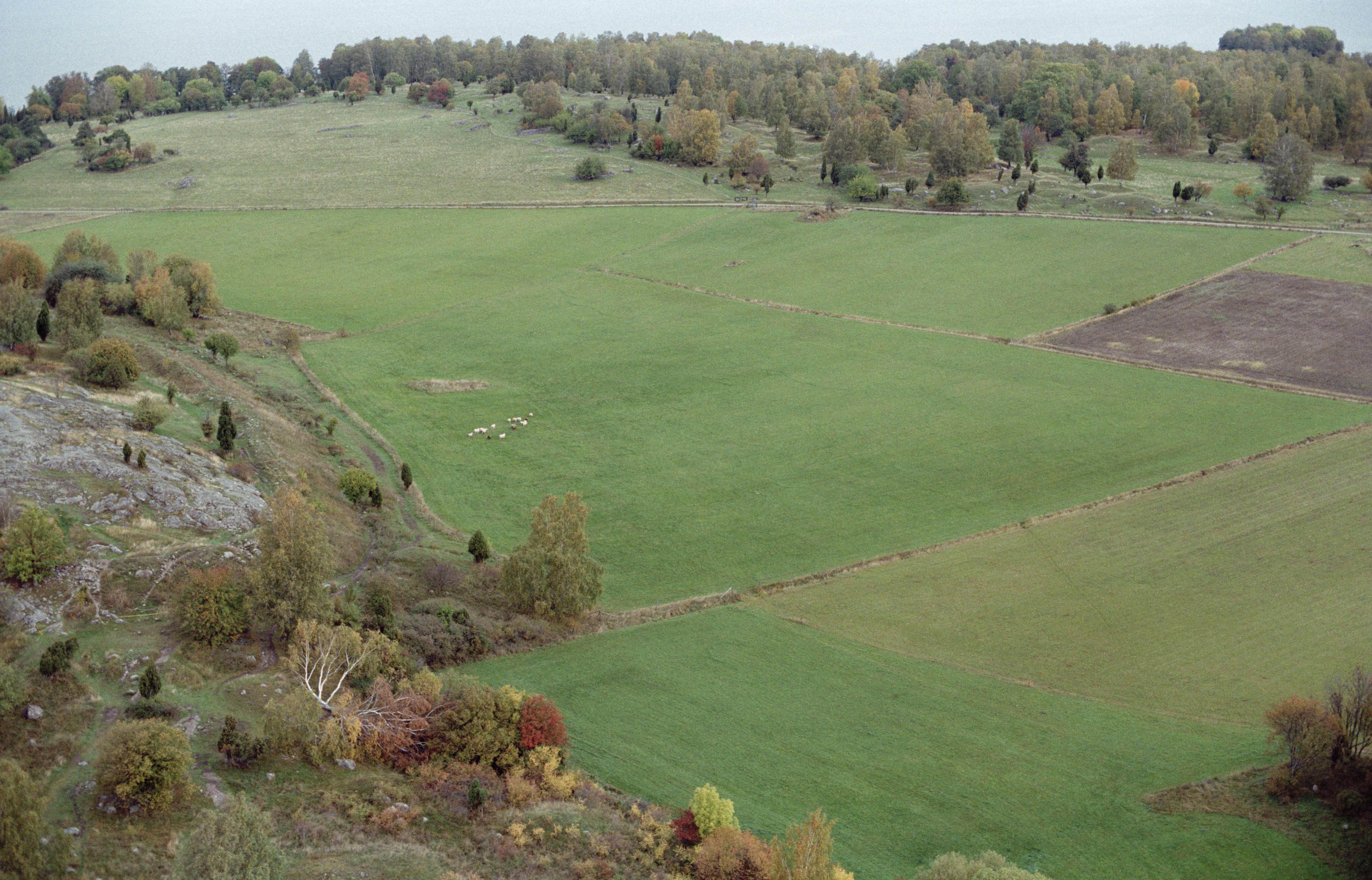 Beskrivning: Fornlämningsområdet Birka på Björkö i Mälaren. Södra delen av bo- och gravplats Hemlanden och Svarta jorden RAÄnr Adelsö 118:1 vid Stadsvallen Adelsö 119:1-2. Område med en evt (evt.) "pallisad / pallisadfäste". Till vänster gravfält Borgs hage RAÄnr 35:1 vid fornborg Borg Adelsö 34:1. Bilden är tagen mot (väderstreck): NNO