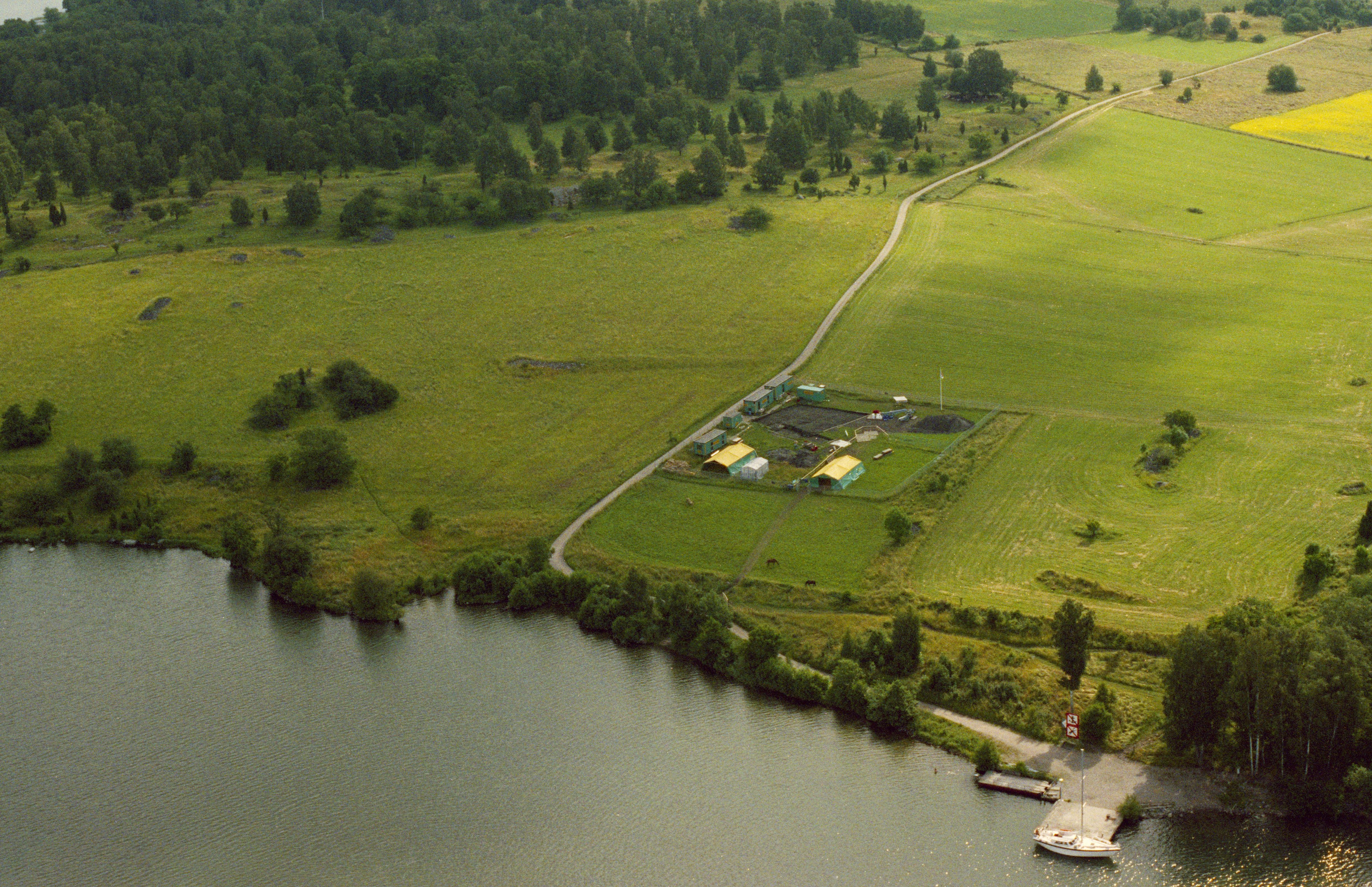 Beskrivning: Fornlämningsområdet Birka på Björkö i Mälaren. Vid bildens mitt arkeologisk undersökning i norra delen av ön i bo- och gravplats Hemlanden och Svarta jorden RAÄnr Adelsö 118:1 vid Stadsvallen Adelsö 119:1-2. Bilden är tagen mot (väderstreck): Ö