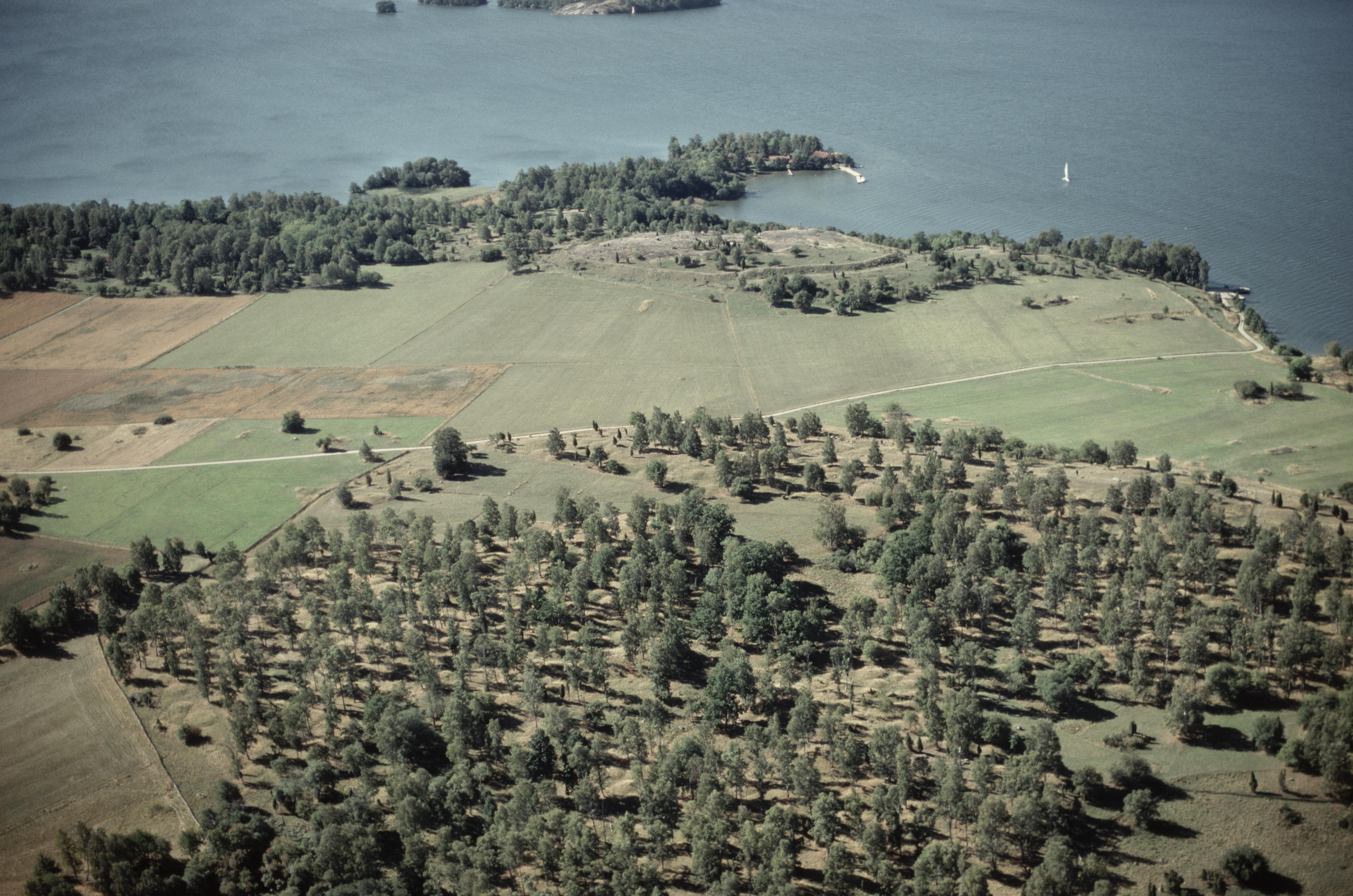 Beskrivning: Fornlämningsområdet Birka på Björkö i Mälaren. Norra delen av ön vid bo- och gravplats Hemlanden och Svarta jorden RAÄnr Adelsö 118:1 vid Stadsvallen Adelsö 119:1-2. I bildens övre del gravfält Borgs hage RAÄnr Adelsö 35:1 och fornborg Borg Adelsö 34:1 vid Ångholmen. Bilden är tagen mot (väderstreck): SV