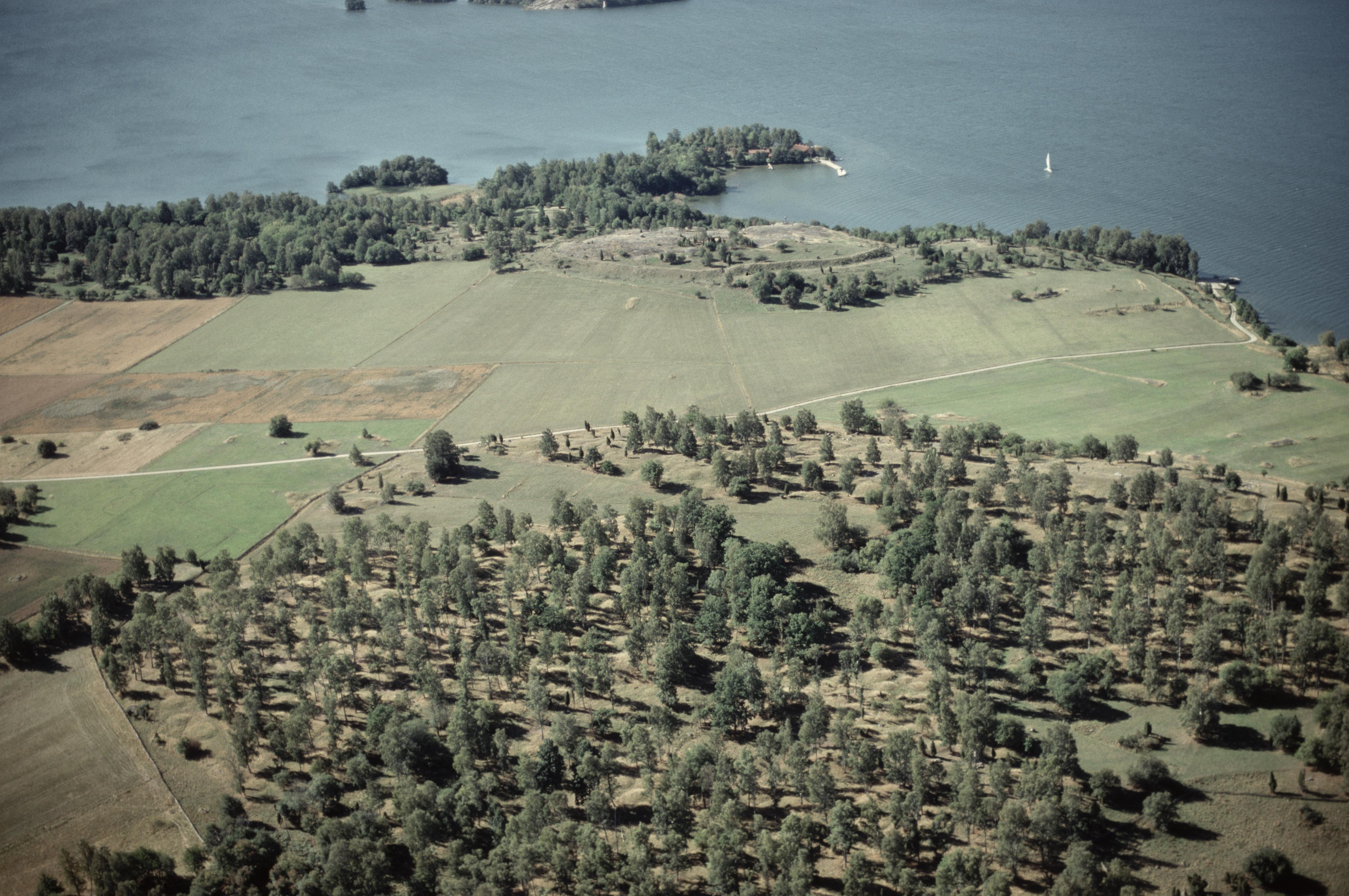 Beskrivning: Fornlämningsområdet Birka på Björkö i Mälaren. Norra delen av ön vid bo- och gravplats Hemlanden och Svarta jorden RAÄnr Adelsö 118:1 vid Stadsvallen Adelsö 119:1-2. I bildens övre del gravfält Borgs hage RAÄnr Adelsö 35:1 och fornborg Borg Adelsö 34:1 vid Ångholmen. Bilden är tagen mot (väderstreck): SV