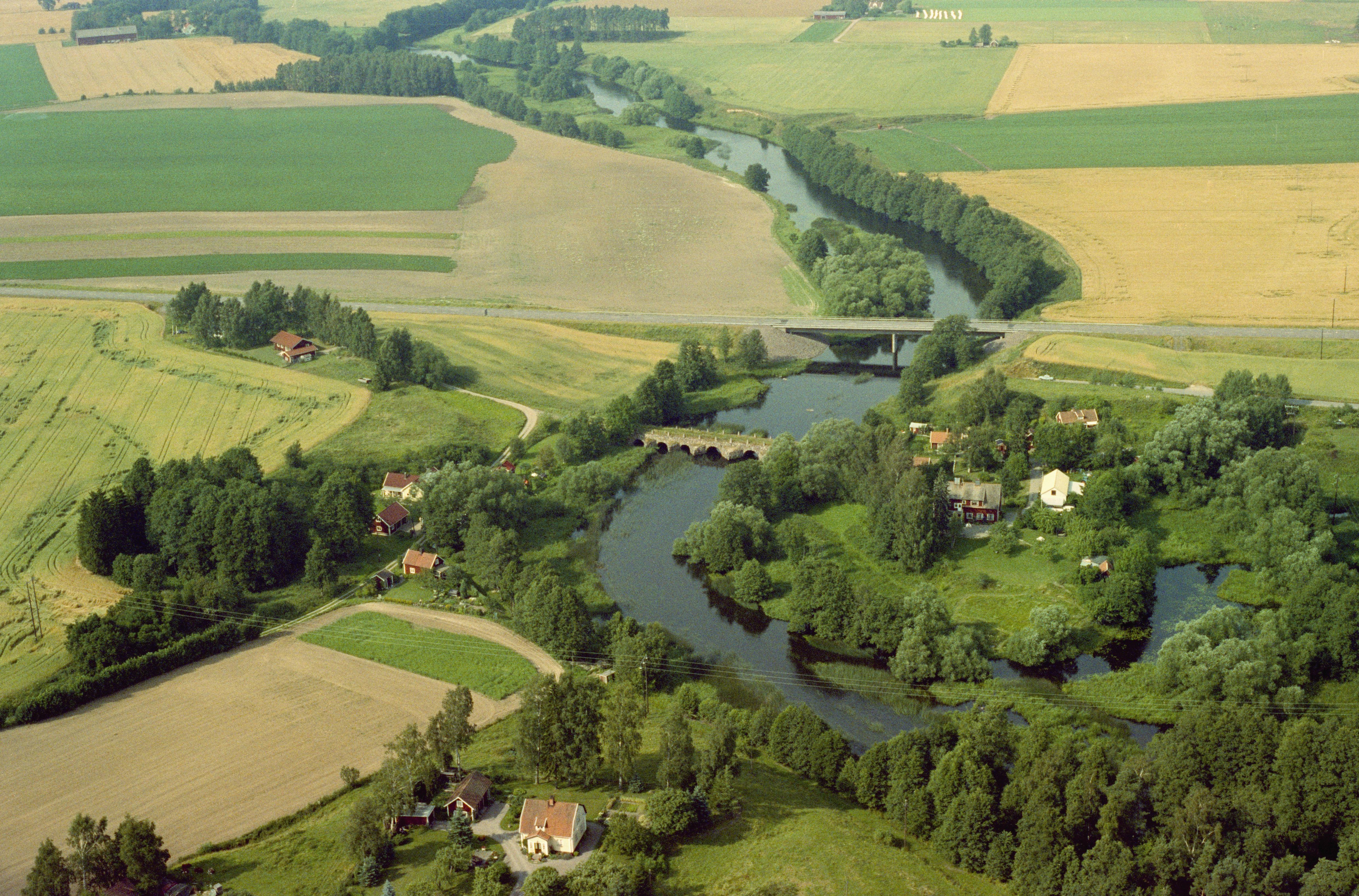 Beskrivning: Öjebro by. Broarna över Svartån. Stenvalvsbro RAÄnr Herrberga 1:1 vid bildens mitt. Bilden är tagen mot (väderstreck): N