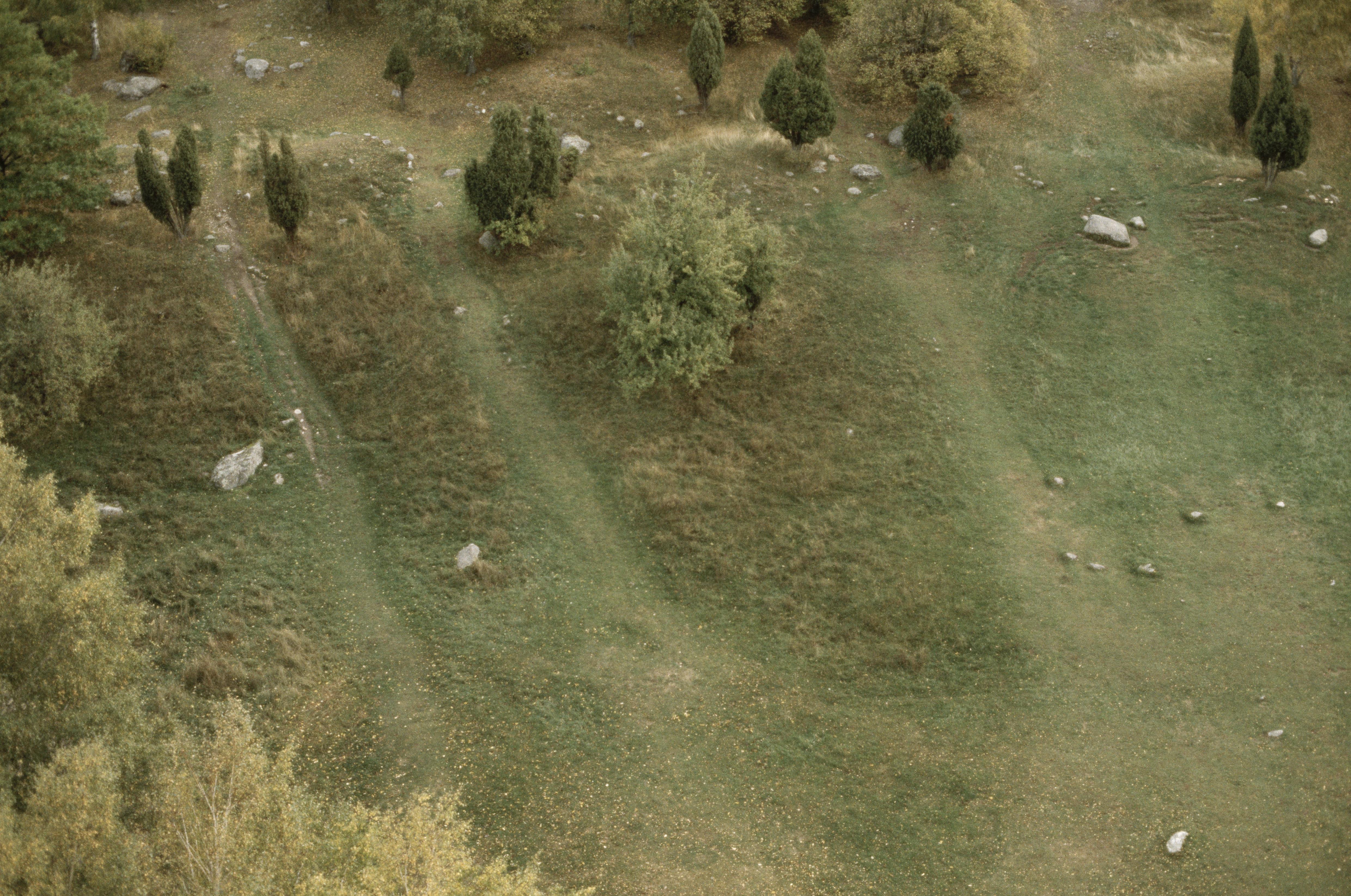 Beskrivning: Fornlämningsområdet Birka på Björkö i Mälaren. Stigar i gravfält Borgs hage RAÄnr Adelsö 35:1 vid fornborg Borg RAÄnr Adelsö 34:1. Bilden är tagen mot (väderstreck): NO