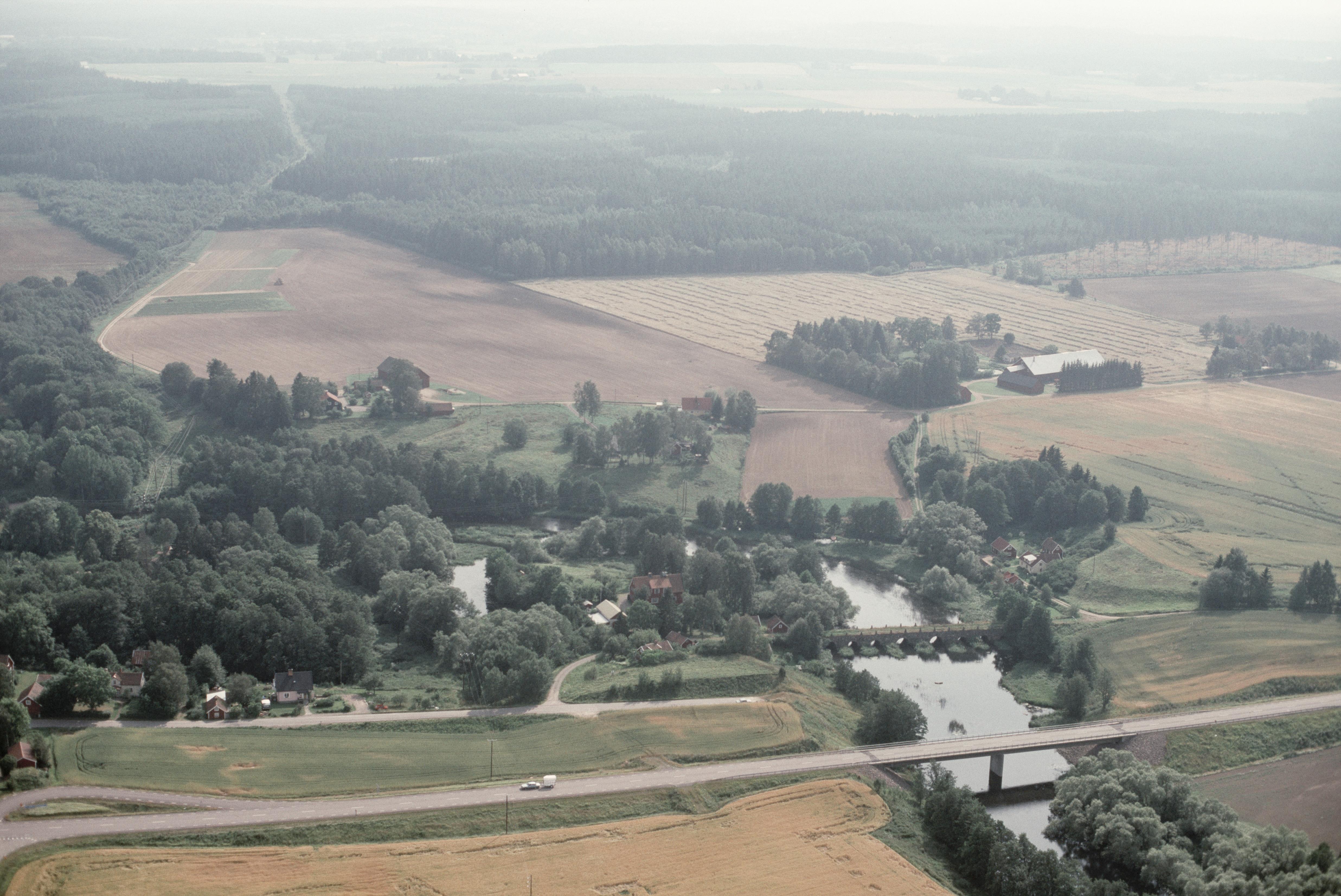 Beskrivning: Öjebro by. Broarna över Svartån. Stenvalvsbro RAÄnr Herrberga 1:1 till höger under bildens mitt. Bilden är tagen mot (väderstreck): S