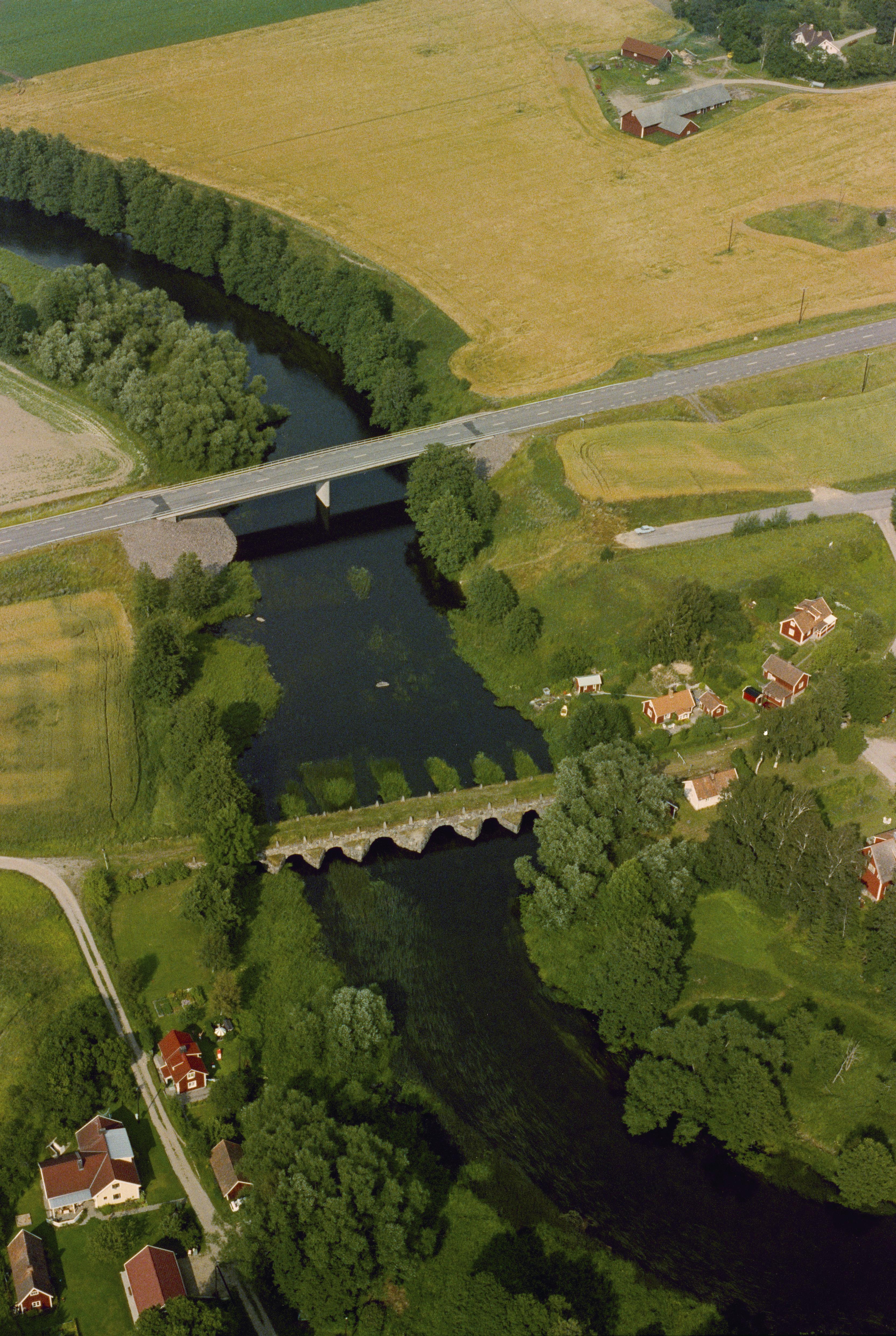 Beskrivning: Öjebro by. Broarna över Svartån. Stenvalvsbro RAÄnr Herrberga 1:1 under bildens mitt. Bilden är tagen mot (väderstreck): ONO