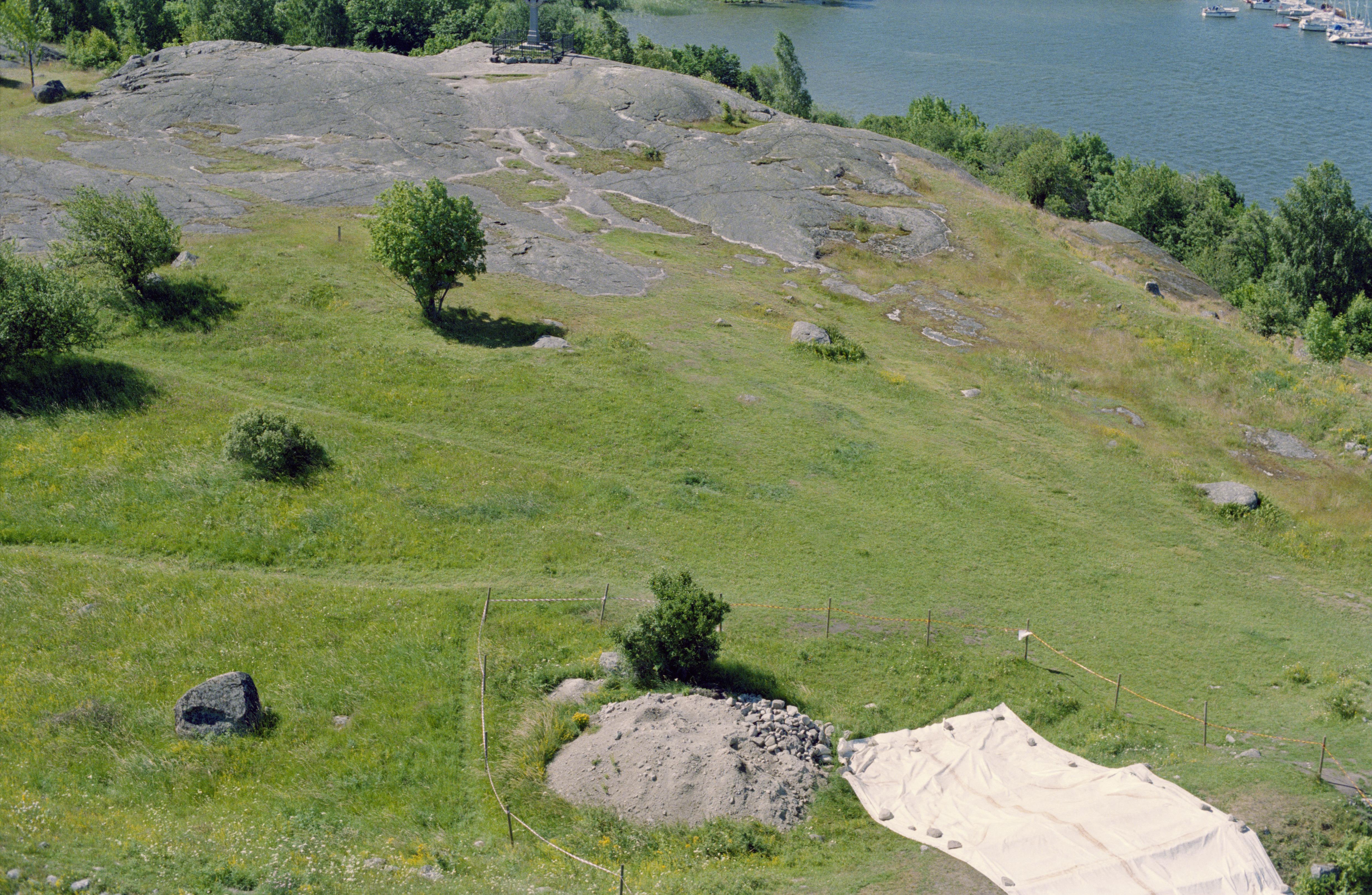 Beskrivning: Fornlämningsområdet Birka på Björkö i Mälaren. Fornborg Borg RAÄnr Adelsö 34:1 i området Garnisonen vid Ansgarsmonumentet och gravfält Borgs hage Adelsö 35:1. Nere till höger arkeologisk undersökning i fornborgsvallen. Bilden är tagen mot (väderstreck): SSV