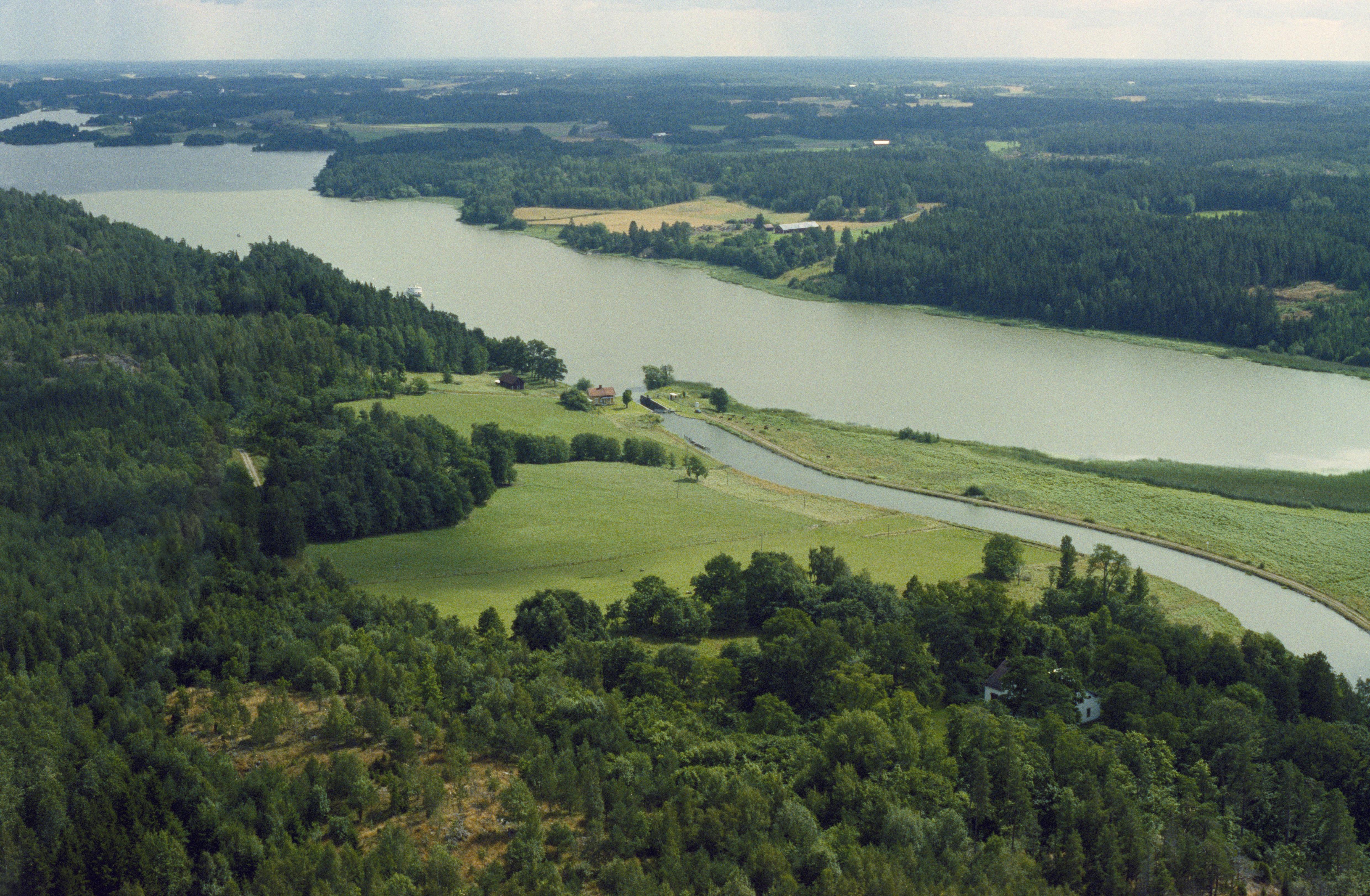 Beskrivning: Göta kanal vid Hulta sluss och sjön Asplången. Vägmärke RAÄnr Kimstad 214:1 till höger om bildens mitt. Socknet Norrköping i bildens nedre del och socknen Västra Husby och Skärkind i bildens övre del. Bilden är tagen mot (väderstreck): SO