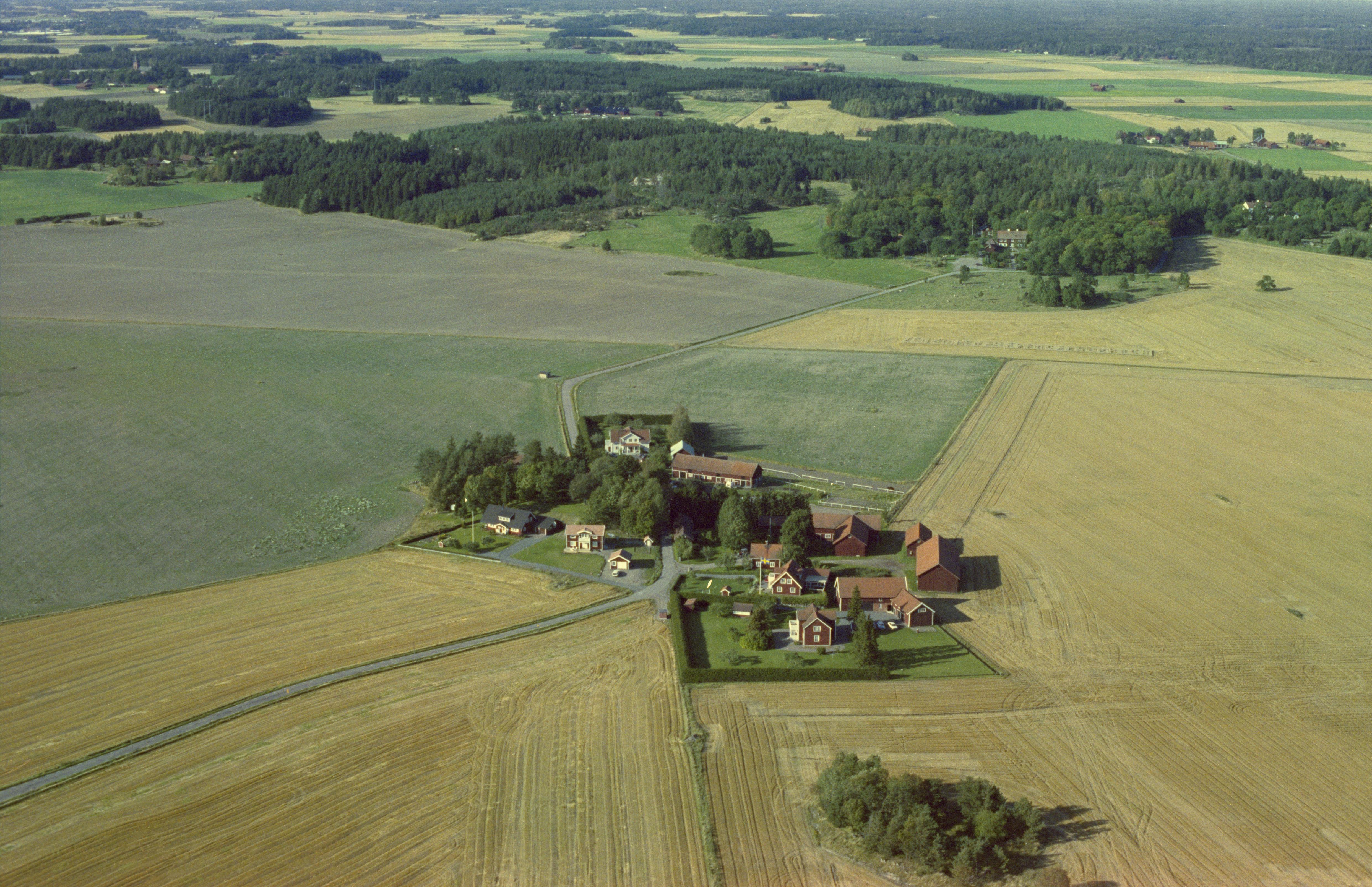 Beskrivning: Edeby gård. På västsidan av gården stensättning RAÄnr Danmark 96:1. I bildens övre del gården Linnés Hammarby. Bilden är tagen mot (väderstreck): NNV