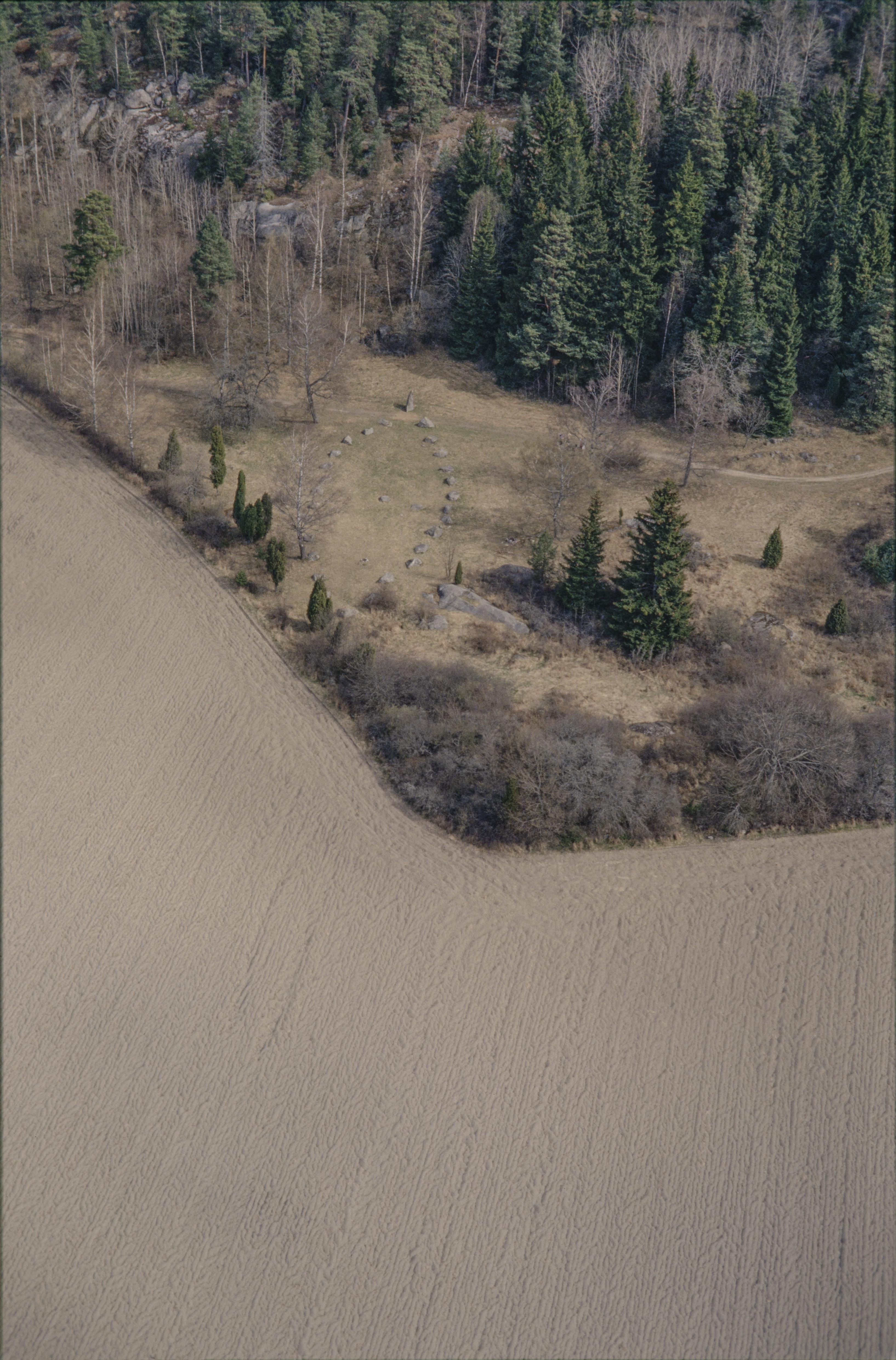 Beskrivning: Anmärkning (övrig): Riksintresse-nr/namn: AB72 - Runsa. Socken: Ed. Motivering: Herrgårdslandskap med ursprung i en stormannagård från yngre järnåldern, vid strategiskt läge mellan flera viktiga vattenleder in mot Uppsala och med en herrgårdsanläggning som speglar högadelns levnadsförhållanden under främst stormaktstiden. (Fornlämningsmiljö). - Uttryck för riksintresset: Farledsanknuten fornborg med ovanligt kraftiga stenvallar, husgrundsterrasser och ett par gravfält med stora gravanläggningar, bl.a. en "kungshög" och en stor skeppssättning. Runsa herrgård med huvudbyggnad från 1663-73 ritad av J de la Vallée, park och ekonomibyggnader. Det av godsdriften präglade landskapet med stora, öppna odlingsmarker, al(…) Texten i detta fält har förkortats vid migrering till e-arkivet. Se filbilagan extra.xml för fullständig information under note_archivist. Beskrivning: Runsa gravfält med skeppssättning RAÄnr Ed 1:1. Bilden är tagen mot (väderstreck): NO Fotosyfte: Flygbildsdokumentation
