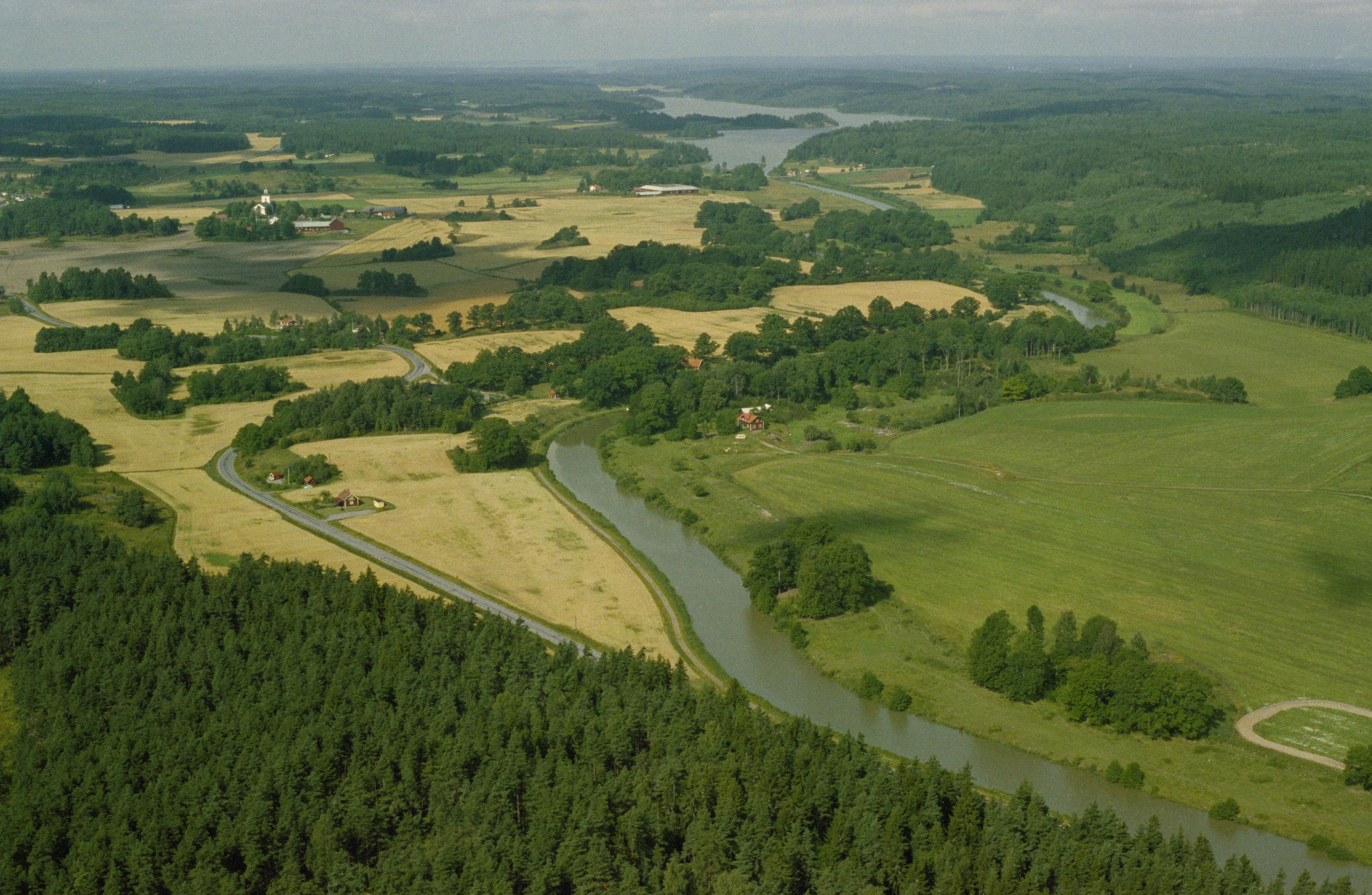 Beskrivning: Göta kanal vid Nedraberg, Klämman och Gäverstad. Kanalmärke RAÄnr Västra Husby 226:1 vid bildens mitt. Västra Husby kyrka i bildens övre del. Bilden är tagen mot (väderstreck): V