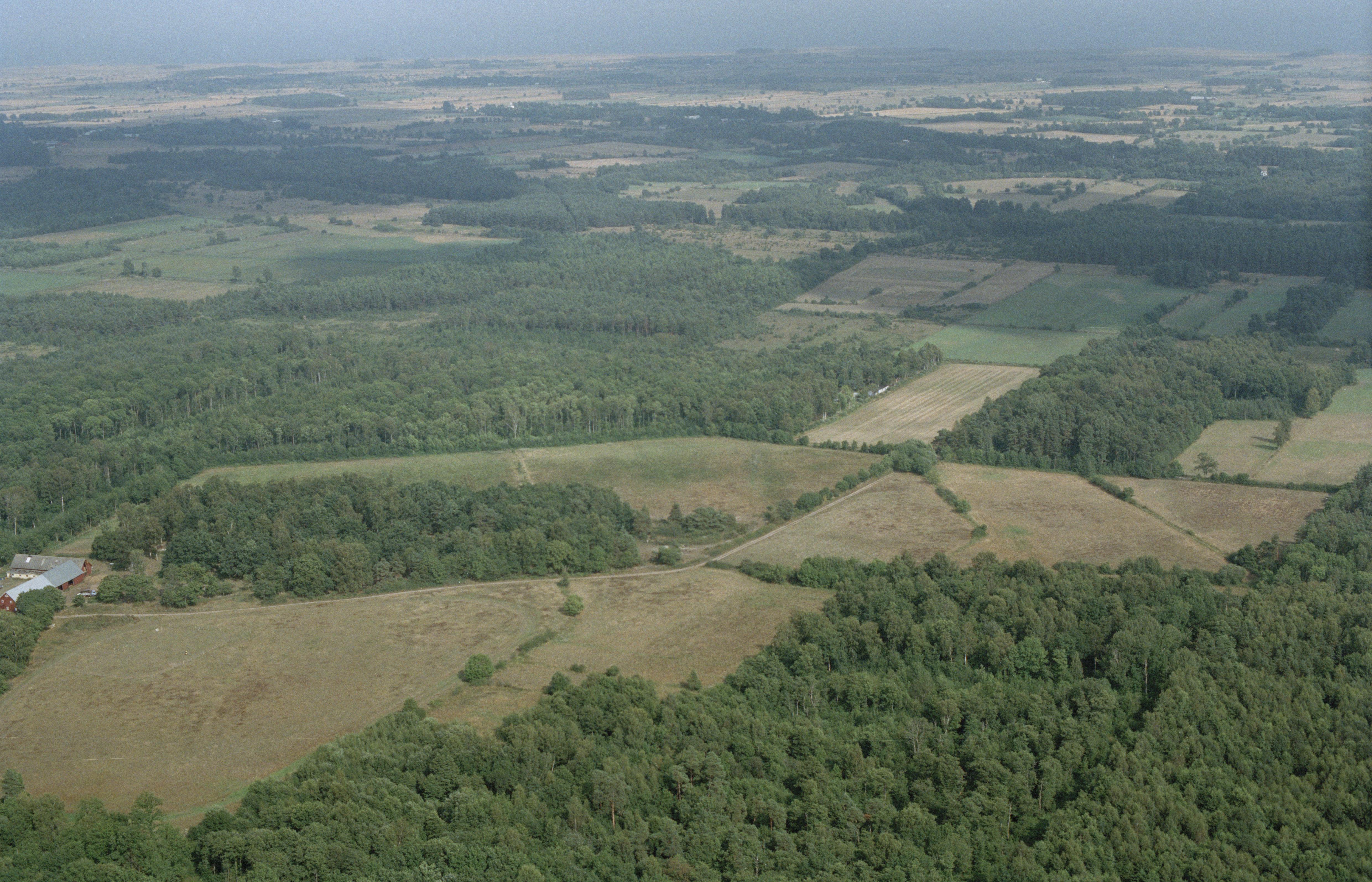 Beskrivning: Skedemosse museum vid gränsen mellan socknen Köping (till vänster), Gärdslösa (till höger) och Bredsätra (i bildens övre del). Vid bildens mitt offerplats RAÄnr Gärdslösa 171:1. Bilden är tagen mot (väderstreck): OSO