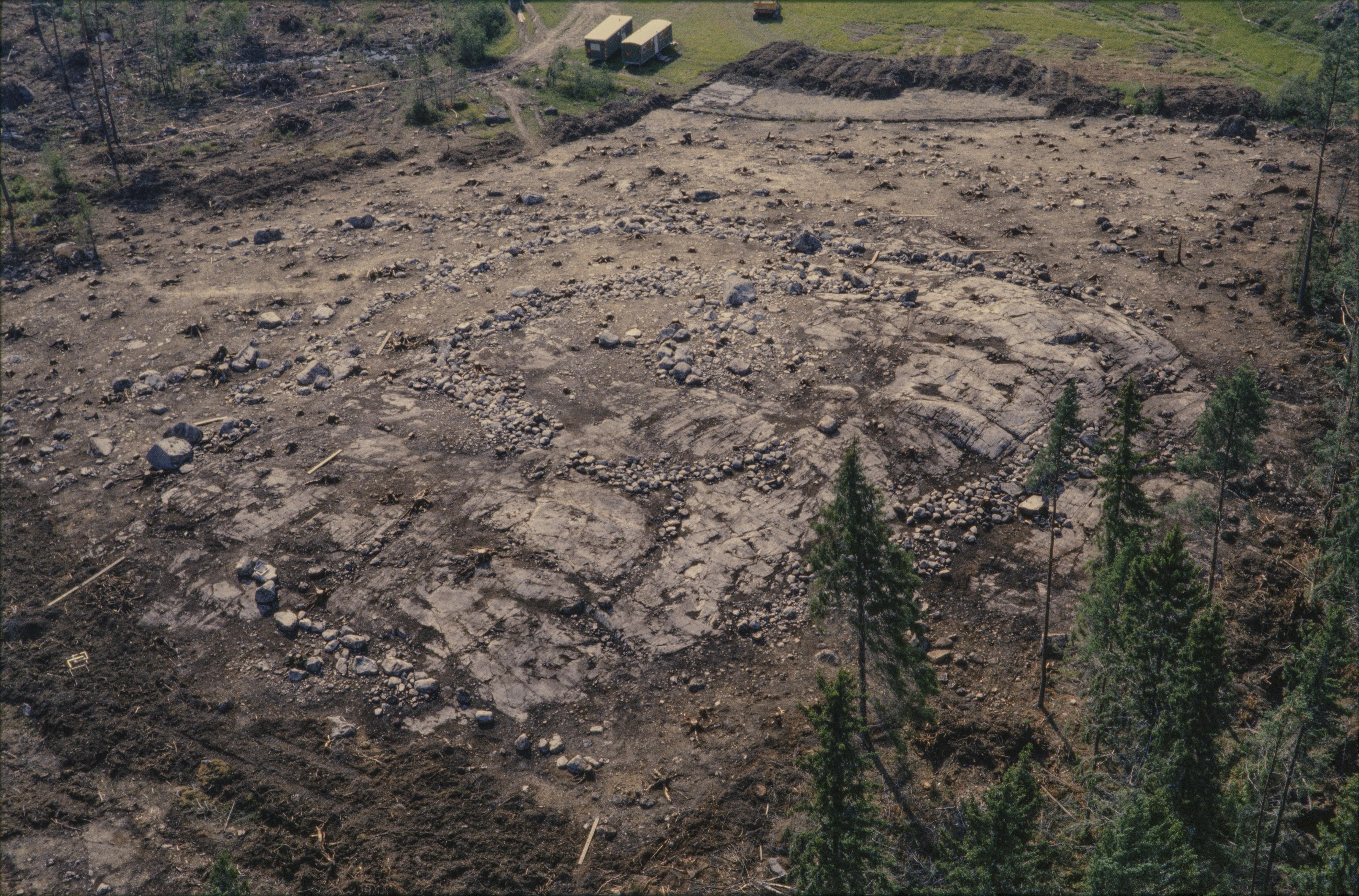 Beskrivning: Arkeologisk undersökning innan bygge av järnväg (Arlandabanan) i Rickebyåns dalgång i områden söder om Svartsjön. Fornborg Odensala 235:1, boplats Odensala 489:1, m.fl. Bilden är tagen mot (väderstreck): SSO