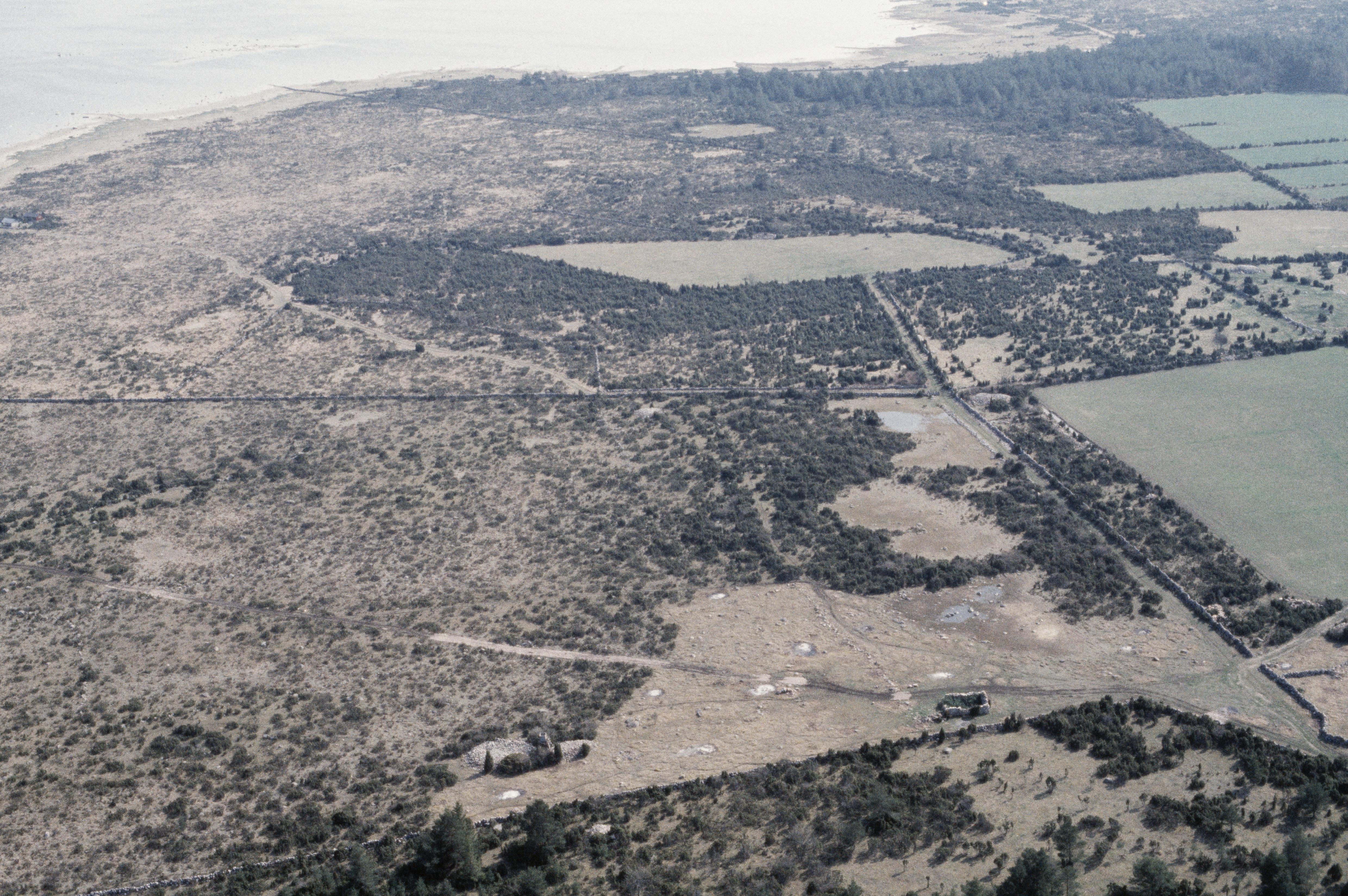 Beskrivning: Trullbjärg norrost om Djurstad. Boplats RAÄnr RAÄnr Föra 4:1 (vid bildens mitt), hägnader Föra 10:3 m.fl. Bilden är tagen mot (väderstreck): SO