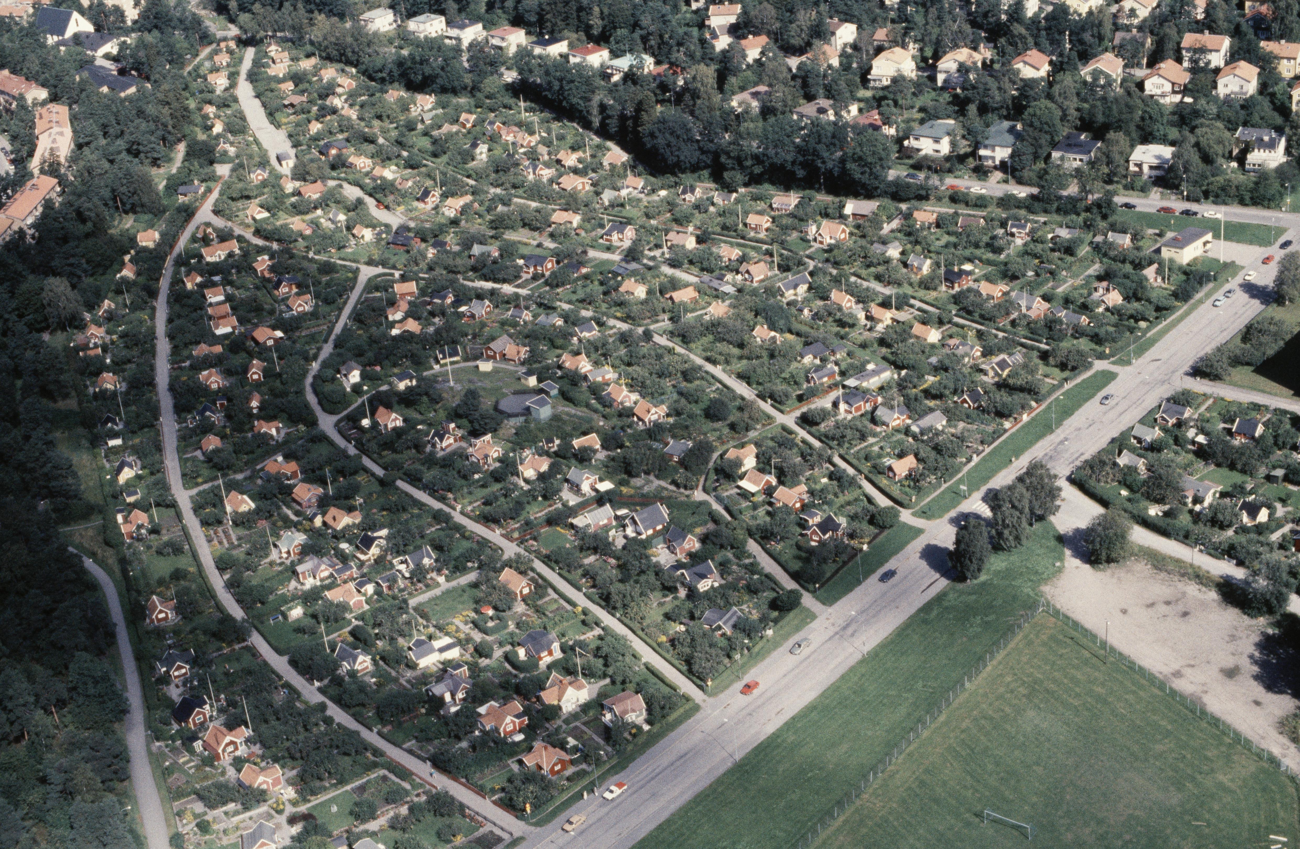 Beskrivning: Området Stora Mossen och Abrahamsberg i stadsdelen Bromma i Stockholms Västerort. Vid bildens mitt Stora Mossens koloniområde. Bilden är tagen mot (väderstreck): N