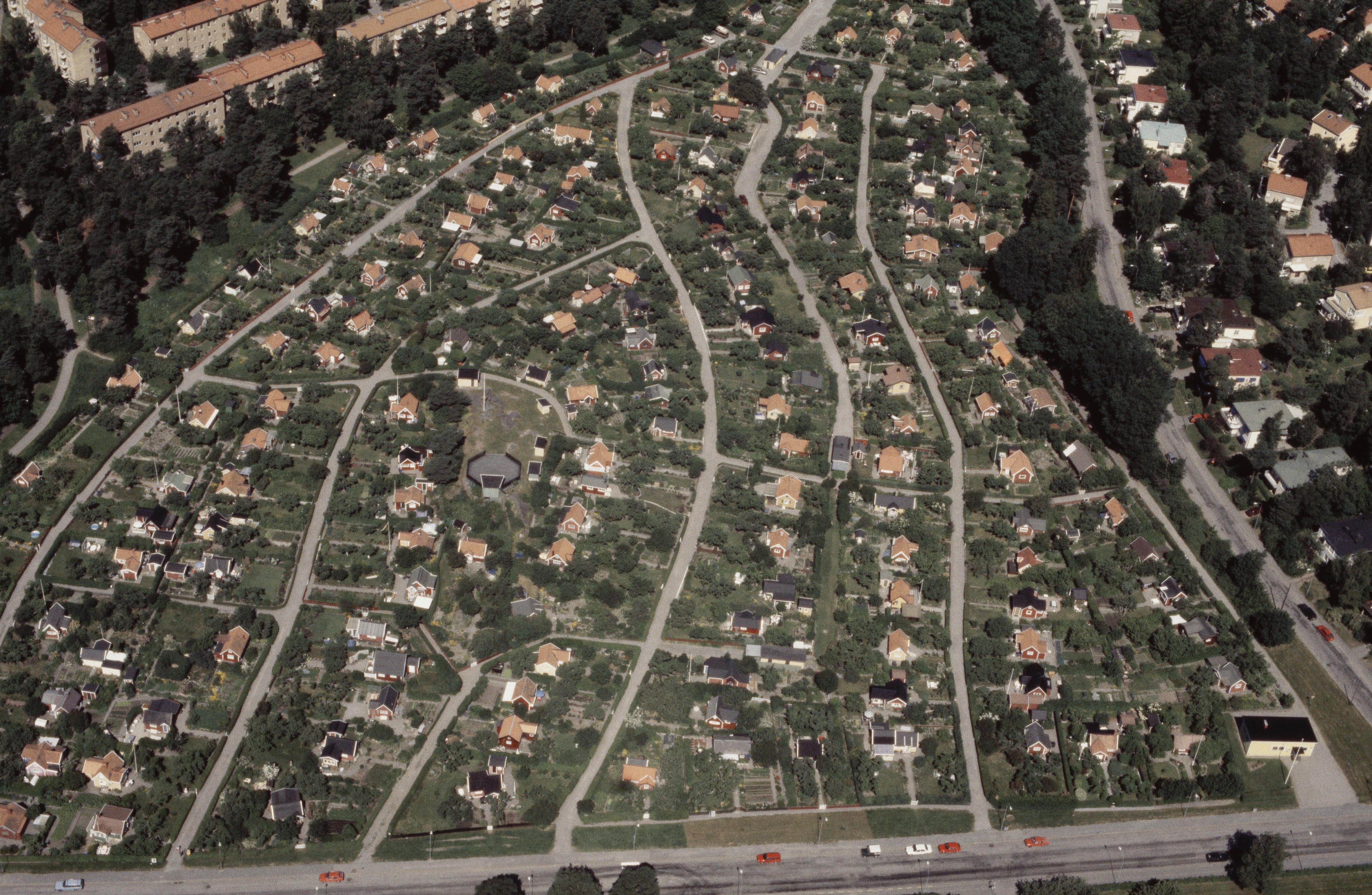 Beskrivning: Området Stora Mossen och Abrahamsberg i stadsdelen Bromma i Stockholms Västerort. Vid bildens mitt Stora Mossens koloniområde. Bilden är tagen mot (väderstreck): NNV