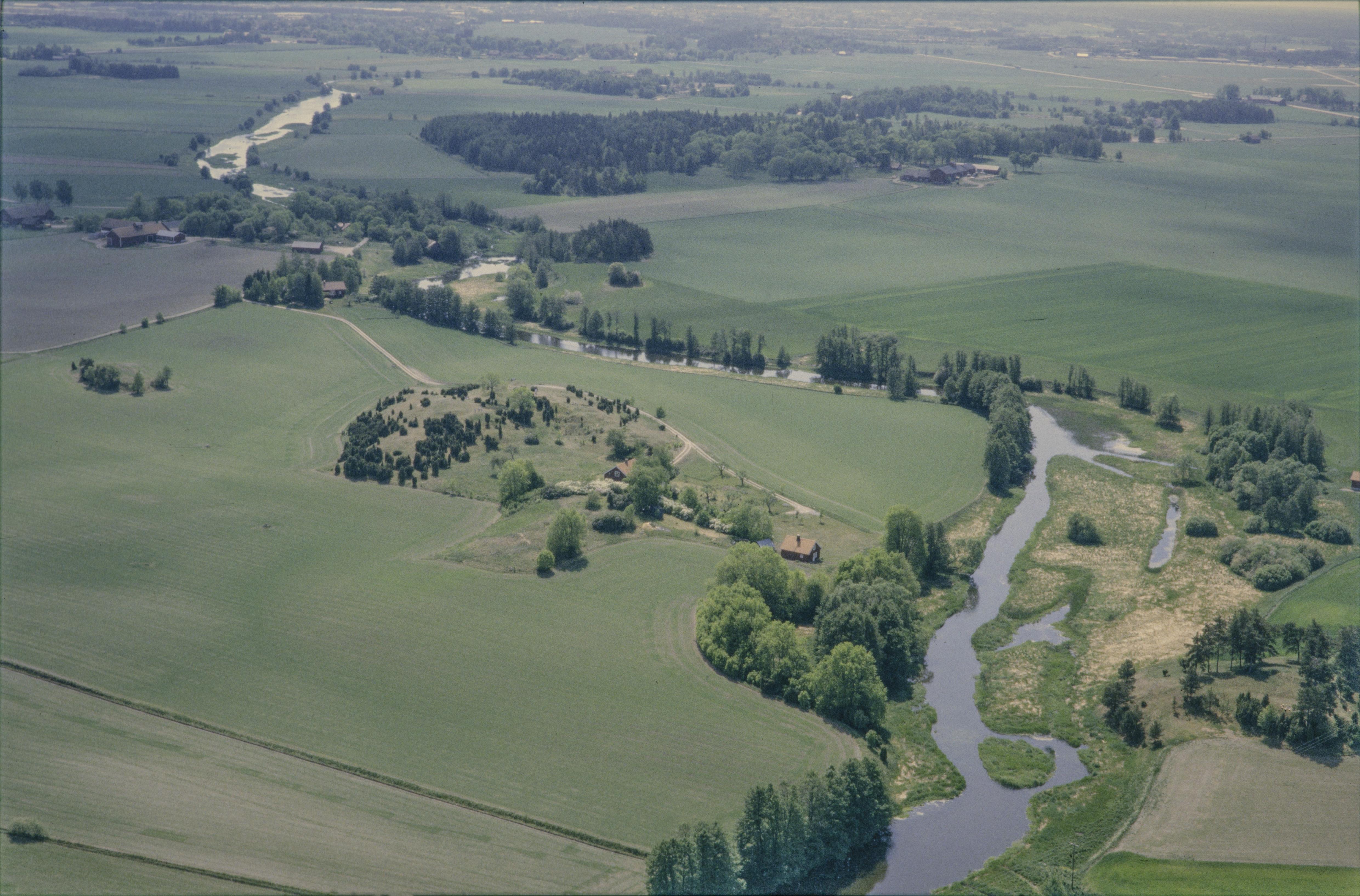 Beskrivning: Fyrisåns dalgång. Ån markerar gränsen mot socknet Bälinge (i bildens övre och högra del). Vid bildens mitt Valsgärde (skrivs även Vallsgärde) gravfält RAÄnr Uppsala 209:1. Nere till höger stensättning RAÄnr Bälinge 310:1. Bilden är tagen mot (väderstreck): S