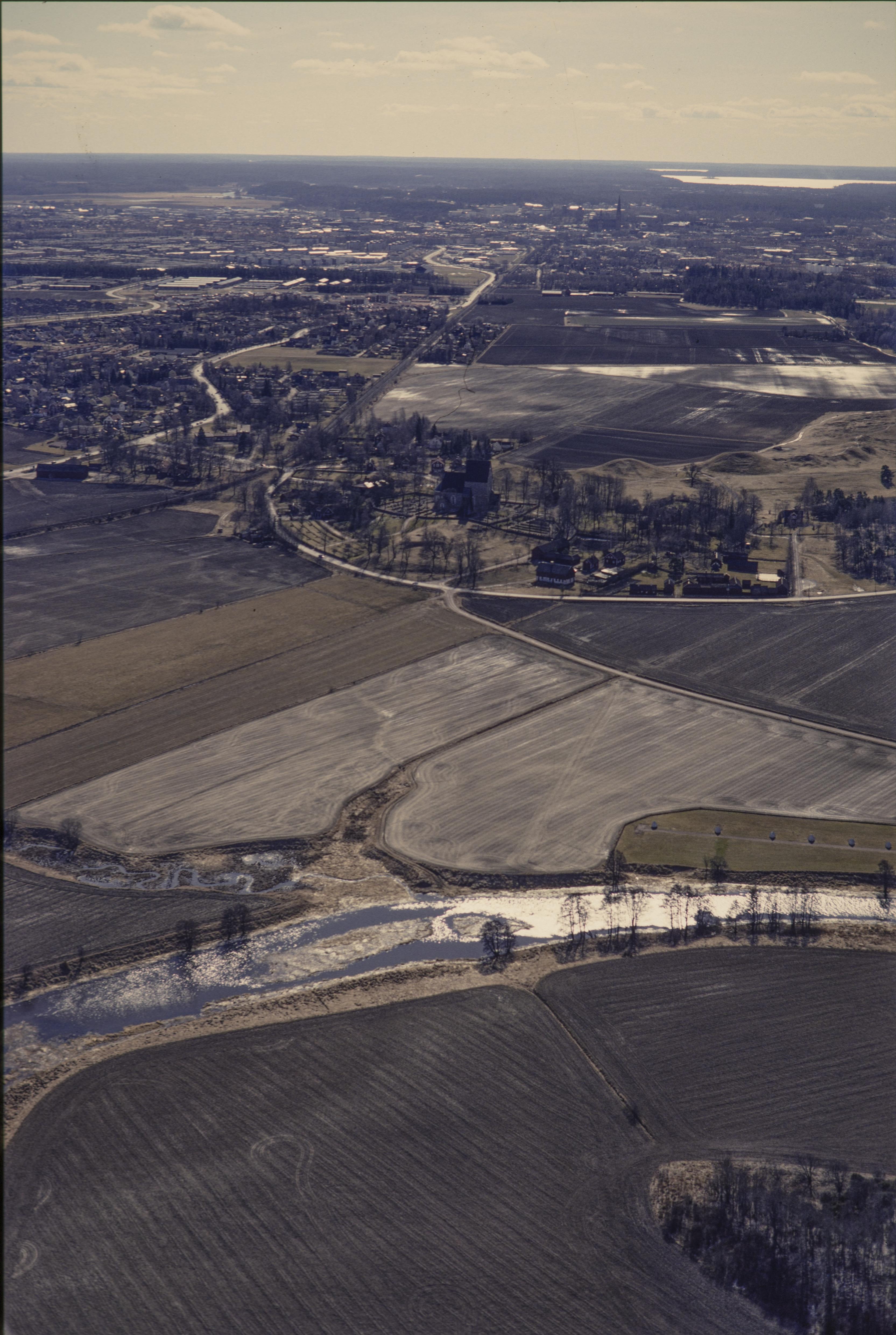 Beskrivning: Anmärkning (övrig): Riksintresse-nr/namn: C30 - Gamla Uppsala samt Fyrisåns och Björklingeåns dalgångar. Socken: Björklinge, Bälinge, Gamla Uppsala, Lena, Tensta och Ärentuna. Motivering: Centralbygd av stor betydelse för rikets historia med kontinuitet sedan bronsåldern och med monumentalt och traditionsbärande rikspolitiskt centrum under forn- och medeltid med kultplats, kungsgård och Sveriges första ärkebiskopssäte. (Fornlämningsmiljö, Kyrkomiljö, Slottsmiljö). - Uttryck för riksintresset: Landets tätaste och mest omfattande bestånd av skärvstenshögar och boplatslämningar från bronsåldern belägna i ådalgångarna. Gamla Uppsala med kungshögar och gravfält från järnåldern, lämningar av kungsgård och tidigmedel(…) Texten i detta fält har förkortats vid migrering till e-arkivet. Se filbilagan extra.xml för fullständig information under note_archivist. Beskrivning: Fyrisåns dalgång. Över bildens mitt Gamla Uppsala kyrka RAÄnr Uppsala 774, Kungshögarna gravfält Uppsala 123:1, boplats Uppsala 263:1 m.fl. Bilden är tagen mot (väderstreck): S Fotosyfte: Flygbildsdokumentation