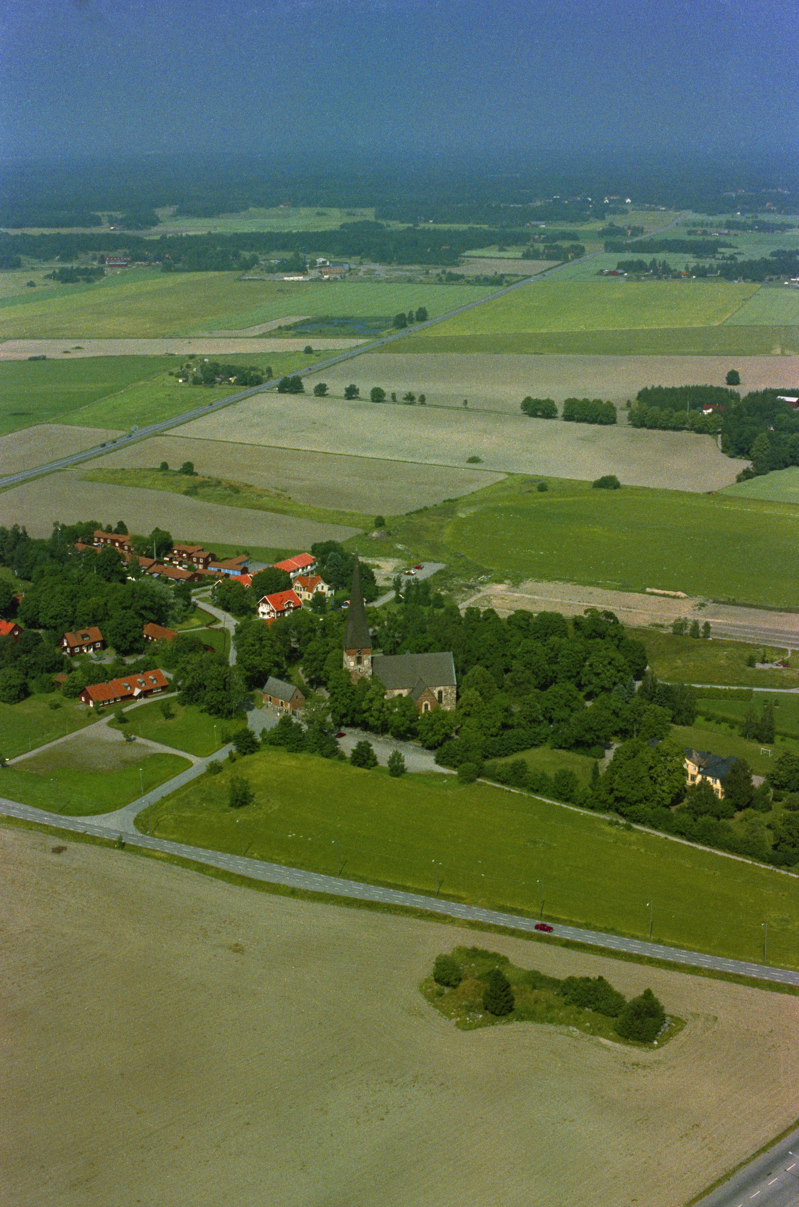 Beskrivning: Vaksala kyrka och kyrkby. Till höger över bildens mitt Vaskesta by. I bildens övre del byarna Eke och Skäve m.fl. Bilden är tagen mot (väderstreck): NNO