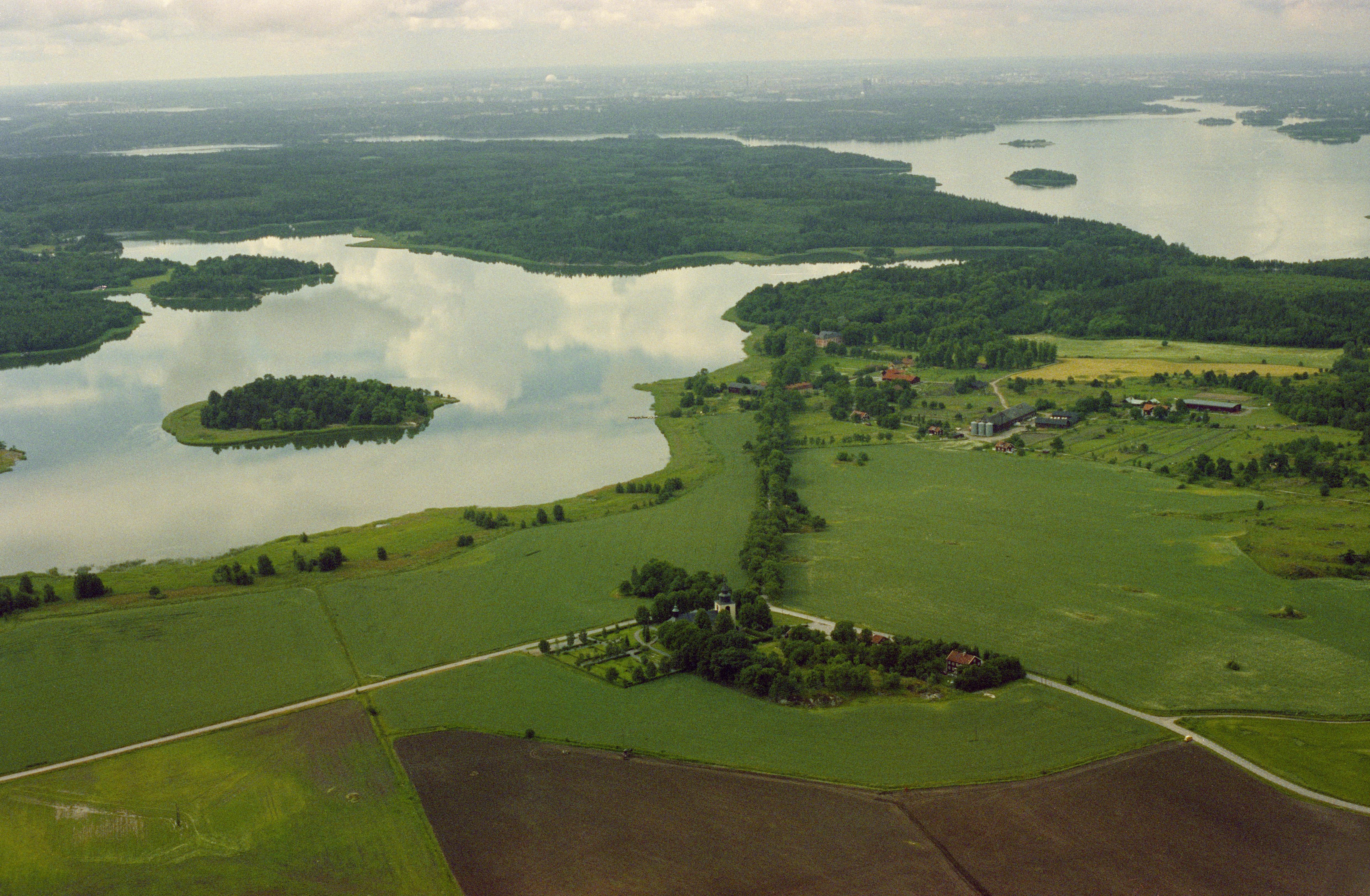 Beskrivning: Östra Ryds kyrka. I bildens övre del Rydboholms slott med Vasatornet - byggnadsminne RAÄnr Östra Ryd 70:1. Kyrkfjärden till vänster och fjärden Stora Värtan uppe till höger. Bilden är tagen mot (väderstreck): SSV