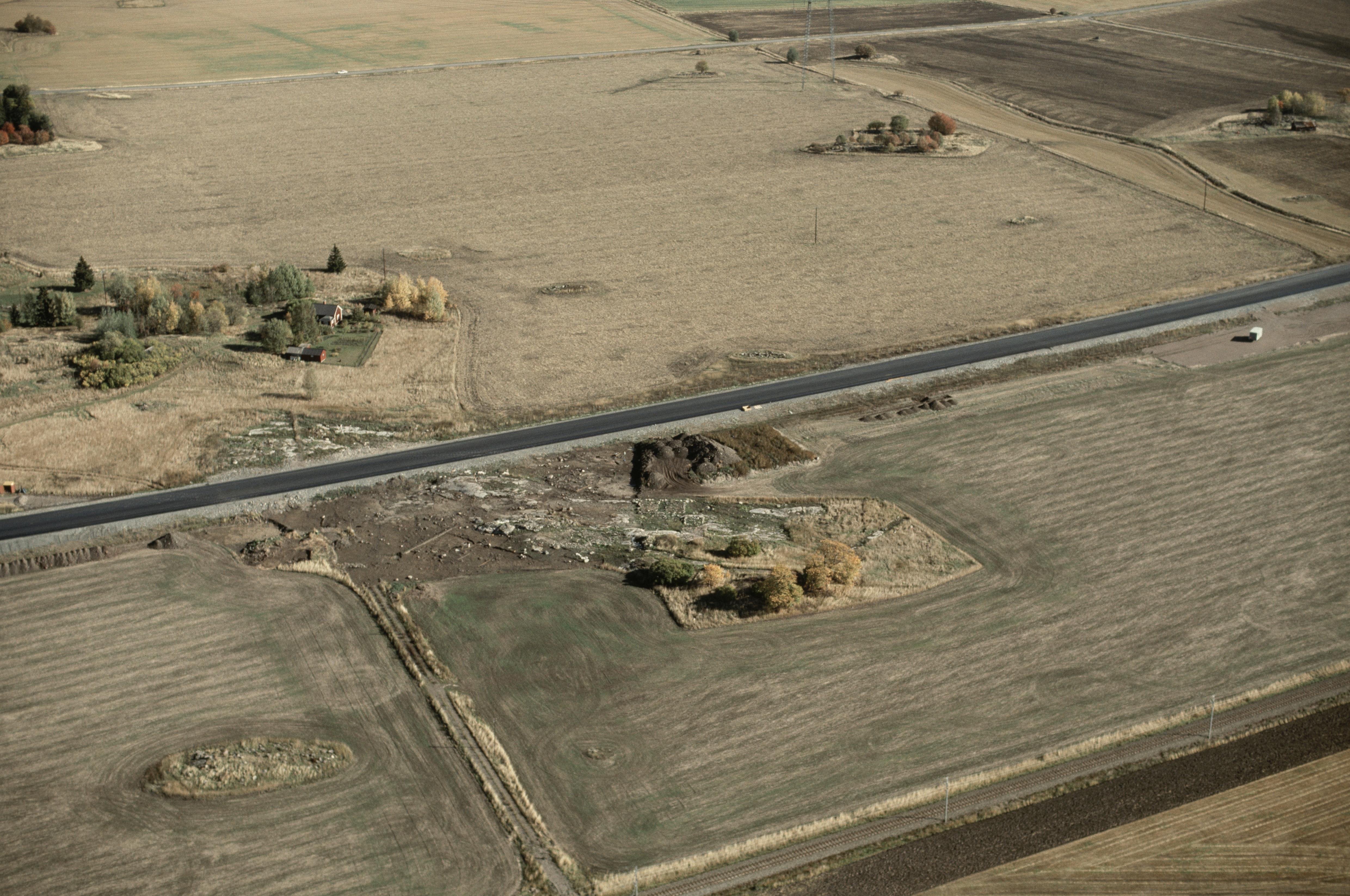 Beskrivning: Arkeologiska undersökningar innan bygge av väg E18 vid Apalle, Högsta och Pollista. I bildens mitt Pollista gamla tomt RAÄnr Övergran 228:1. Bilden är tagen mot (väderstreck): NO