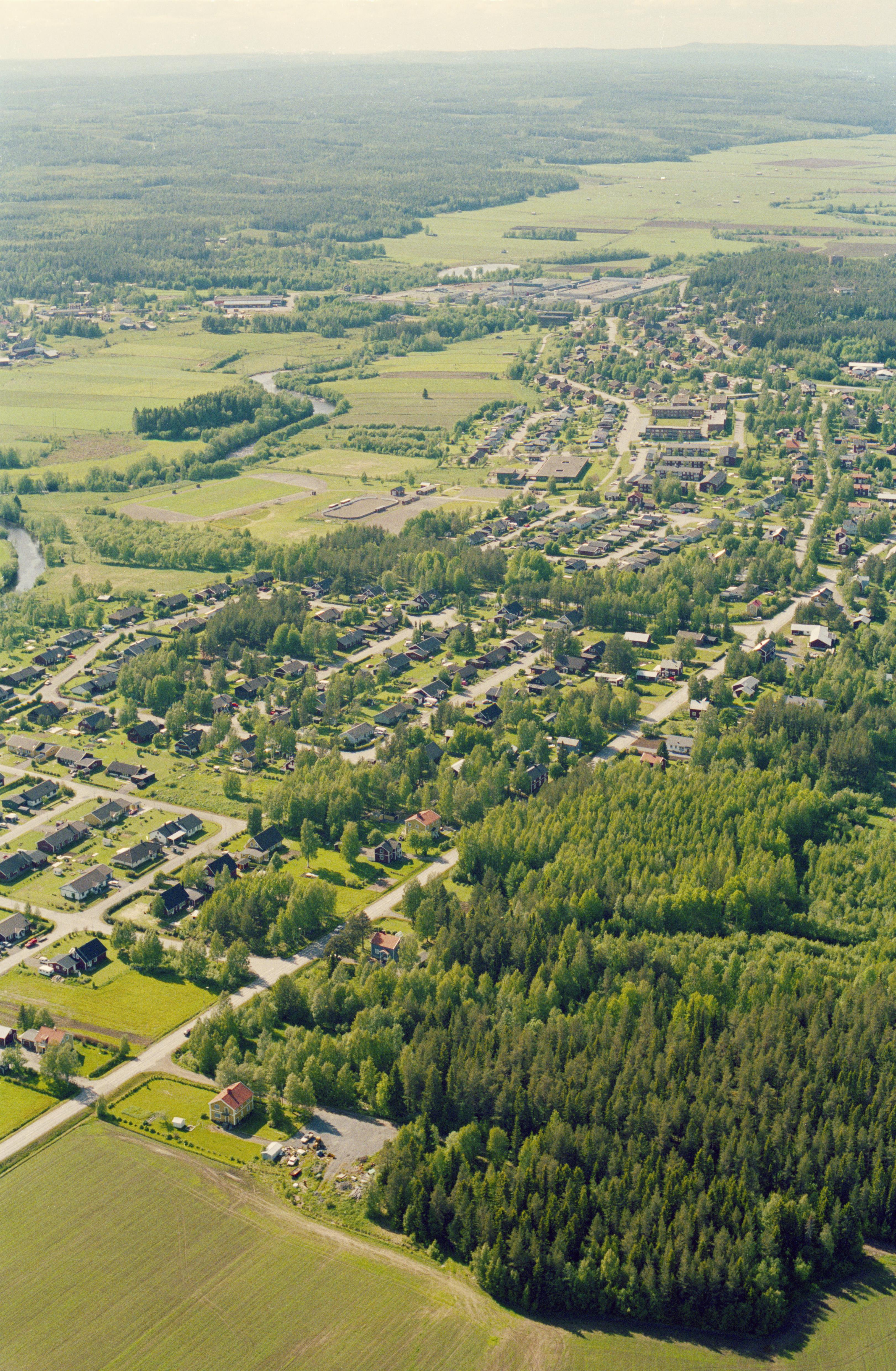 Beskrivning: Kågedalen. Ersmarks tätort vid Kågeälven. Vid Jönsberget till höger över bildens mitt område med kokgrop RAÄnr Skellefteå stad 307:1. Bilden är tagen mot (väderstreck): V