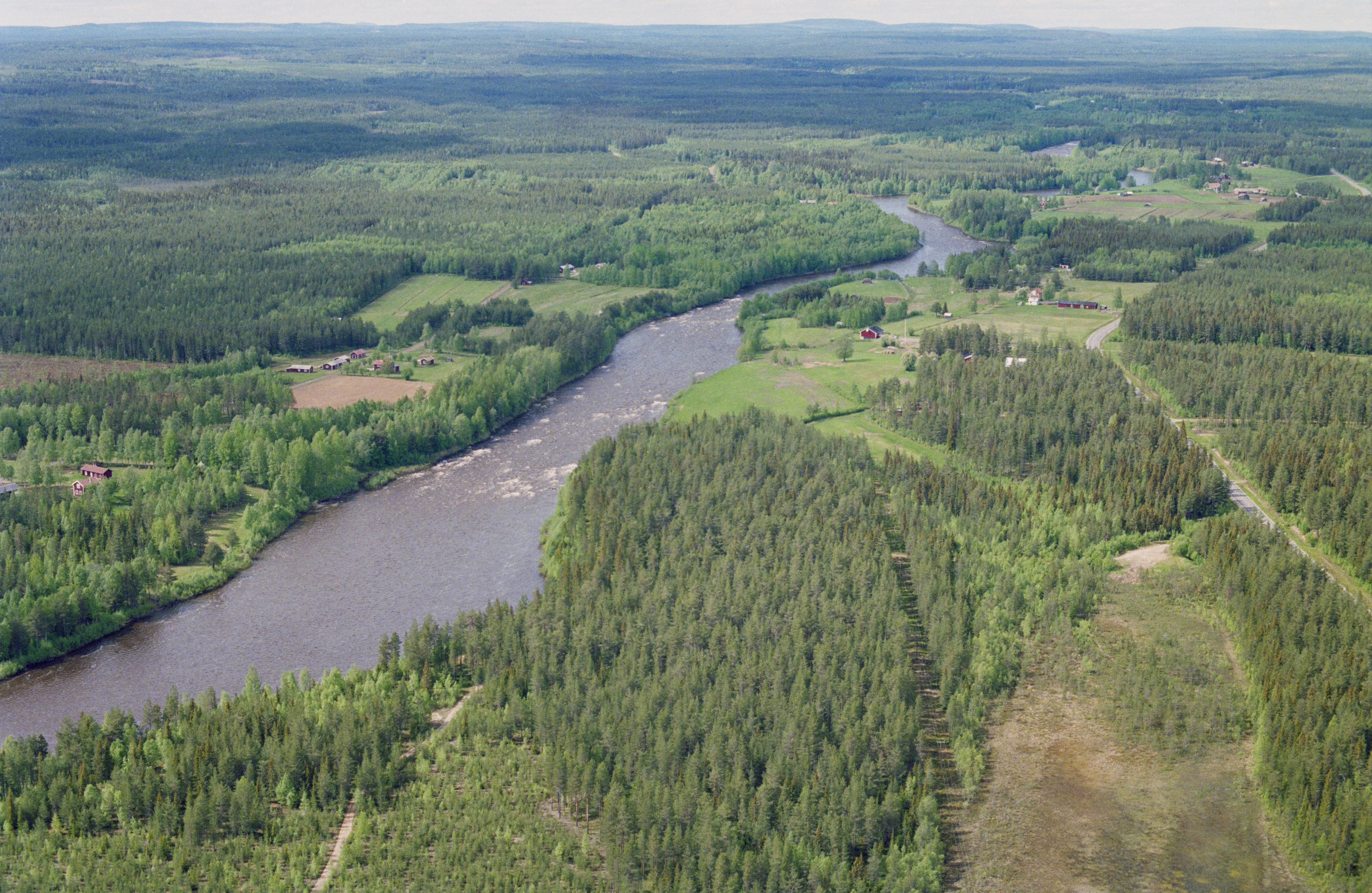 Beskrivning: I bildens mitt Hårdängesforsen i Byskeälven. Till vänster om bildens mitt byn Södra Stensjön. I skogen till vänster i bildens nedre kant en tjärdal/tjärgrop RAÄnr Byske 953. Bilden är tagen mot (väderstreck): VNV
