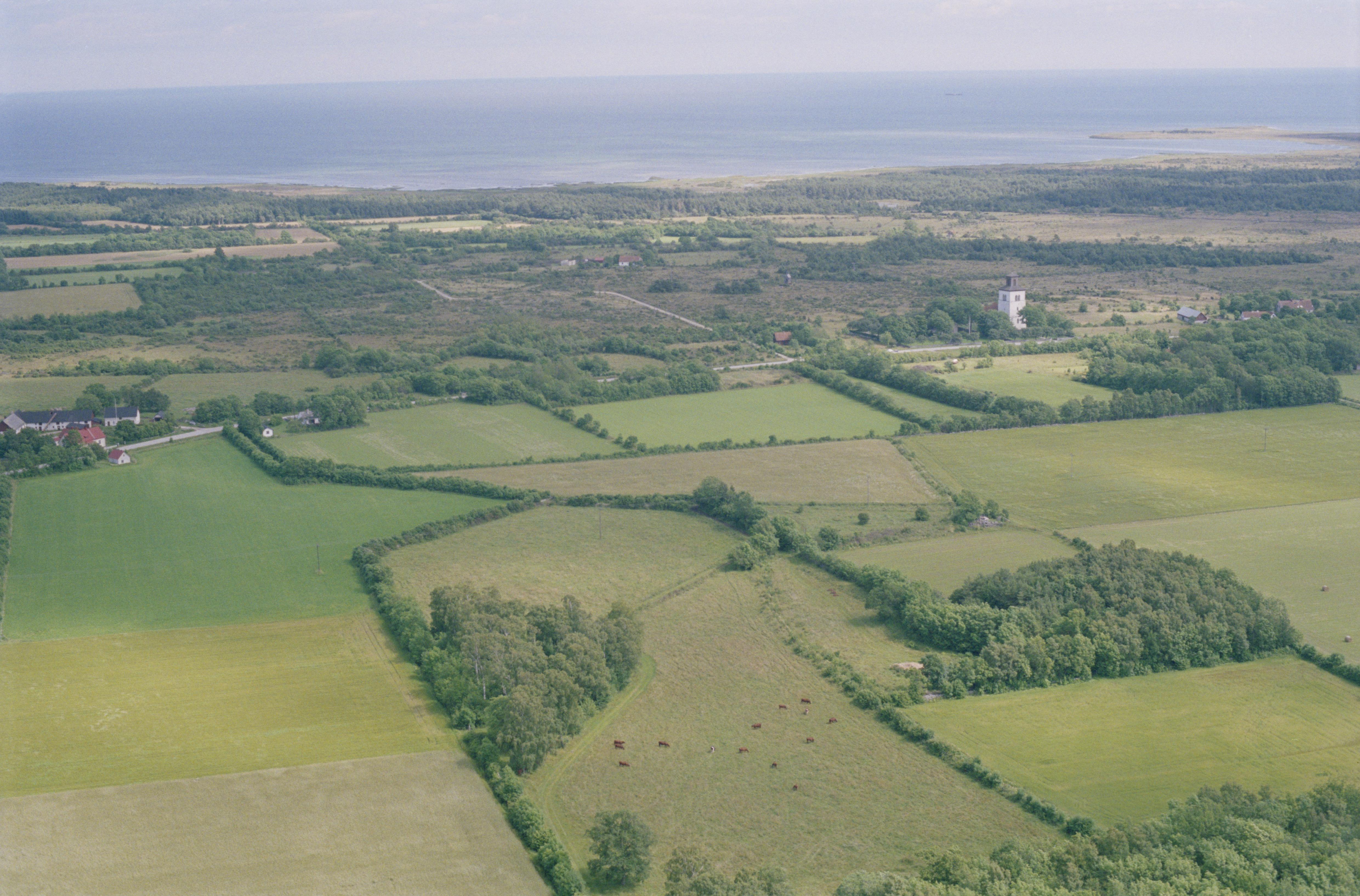Beskrivning: Till höger över bildens mitt Fide kyrka och kyrkby. Vid kyrkan husgrund RAÄnr Fide 28:1. Bilden är tagen mot (väderstreck): OSO