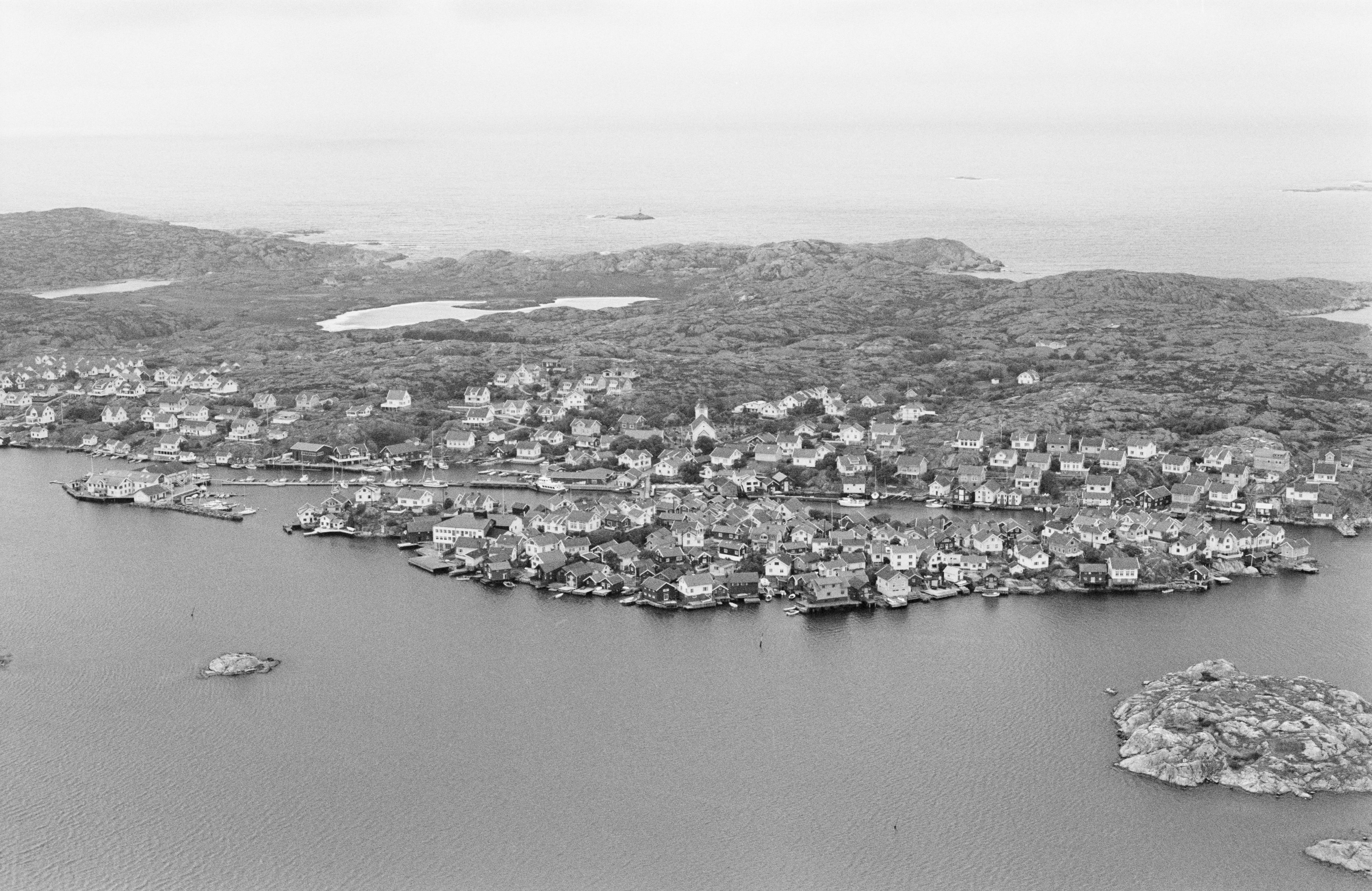Beskrivning: Gullholmens fiskeläge. Gullholmens kyrka vid bildens mitt. Bilden är tagen mot (väderstreck): V