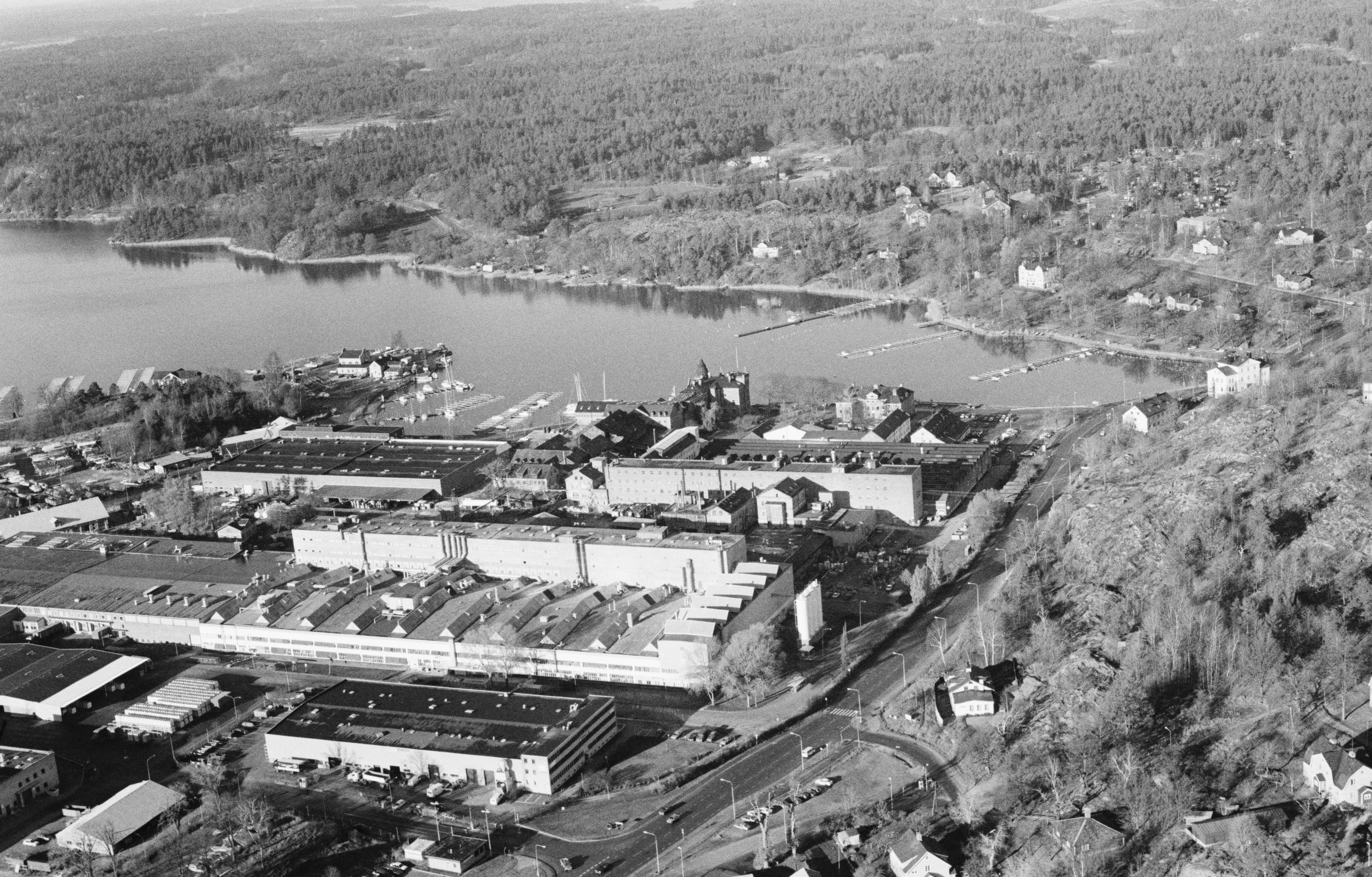 Beskrivning: Gustavsbergs tätort vid Farstaviken. Porslinsfabrikerna. Bilden är tagen mot (väderstreck): NNV