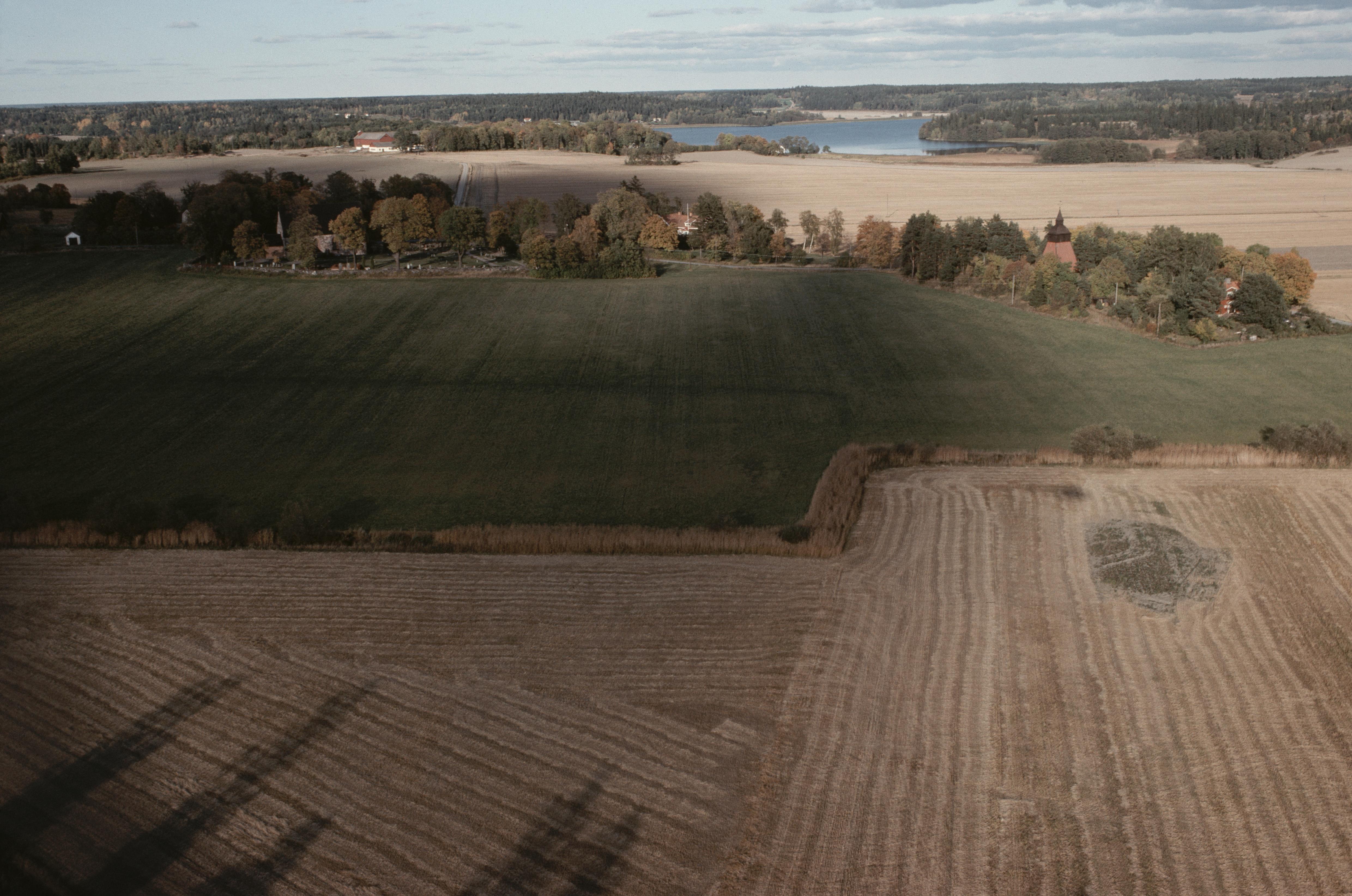 Beskrivning: Håtuna kyrka och kyrkby. Över bildens mitt Prästgårdens gamla tomt RAÄnr Håtuna 157:1. I bildens övre del Håtunaviken i Mälaren mot socknet Sankt Per. Bilden är tagen mot (väderstreck): NO