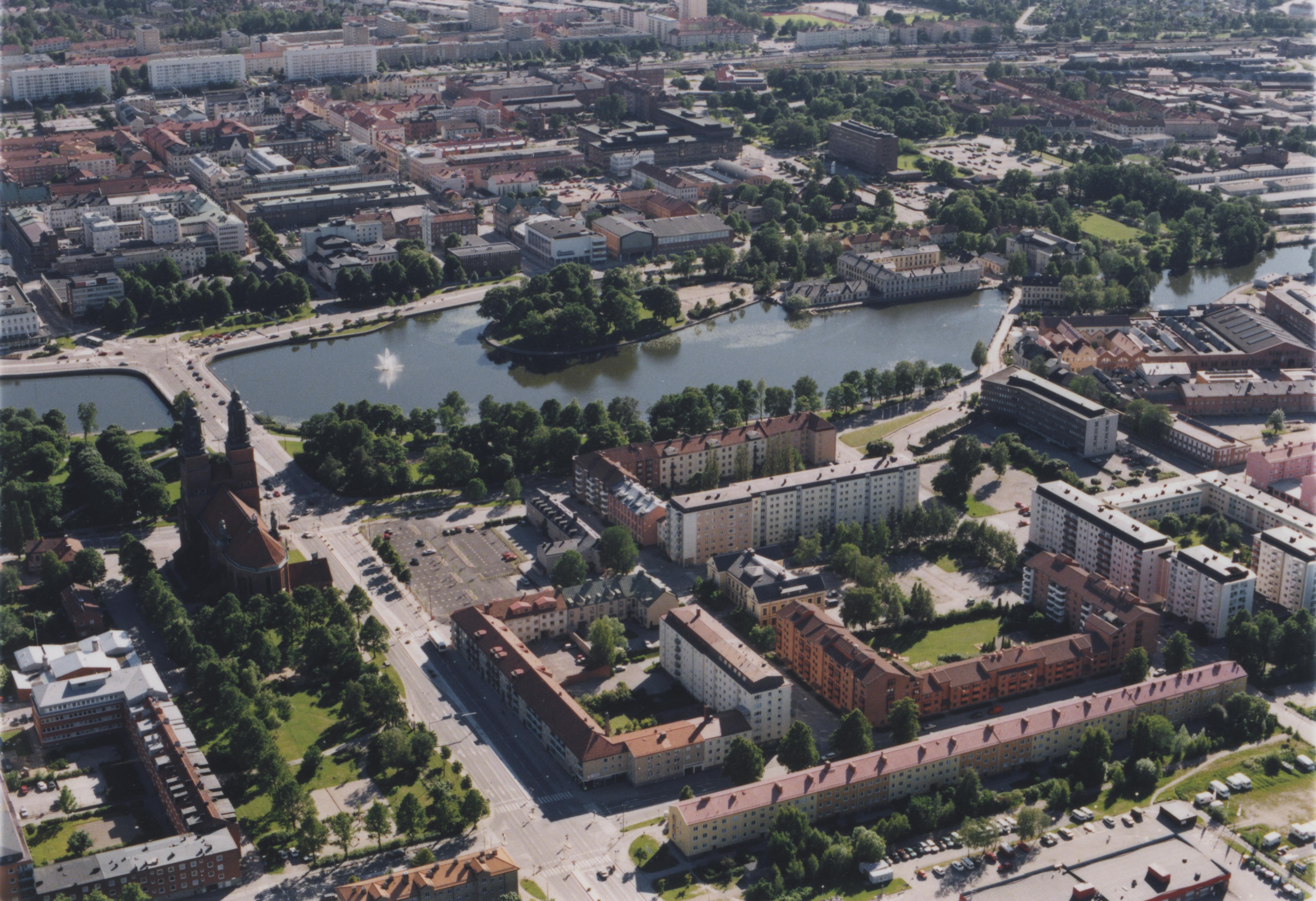 Beskrivning: Eskilstuna stad. Eskilstunaån. Kloster kyrka nere till vänster. Bilden är tagen mot (väderstreck): VSV