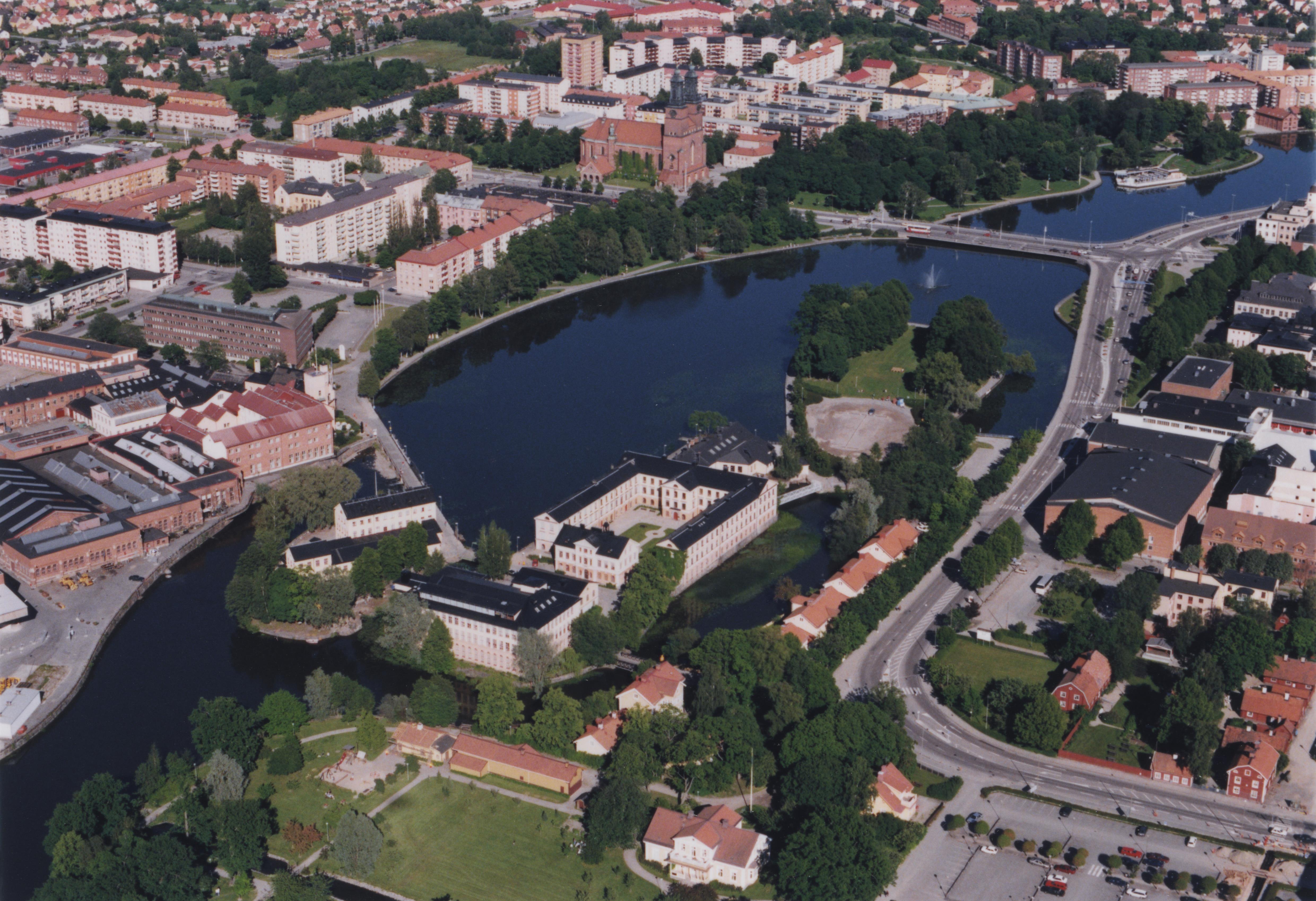 Beskrivning: Eskilstuna stad. Eskilstunaån. Eskilstuna stadsmuseum vid bildens mitt. Klosters kyrka i bildens övre del. Bilden är tagen mot (väderstreck): OSO