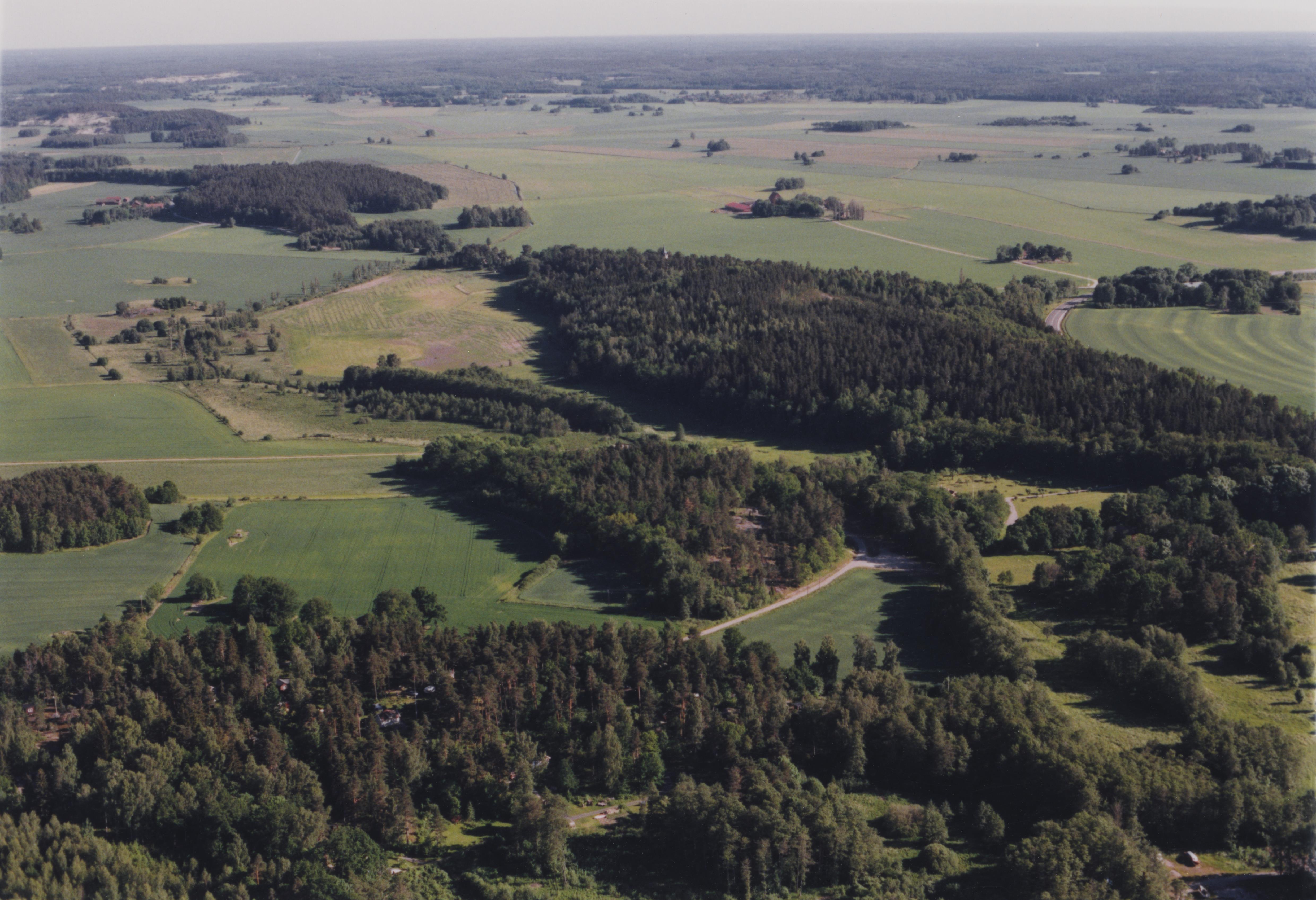Beskrivning: Vid bildens mitt gravfält RAÄnr Jäder 159:1 och runristningen Jäder 39:1 (Sö101) Sigurdsristningen / Ramsundsristningen vid Ramsundsån. Ån markerar gränsen mot socknet Sundby. Sundby kyrka skymtas bland träden i bildens övre del. Bilden är tagen mot (väderstreck): SSV