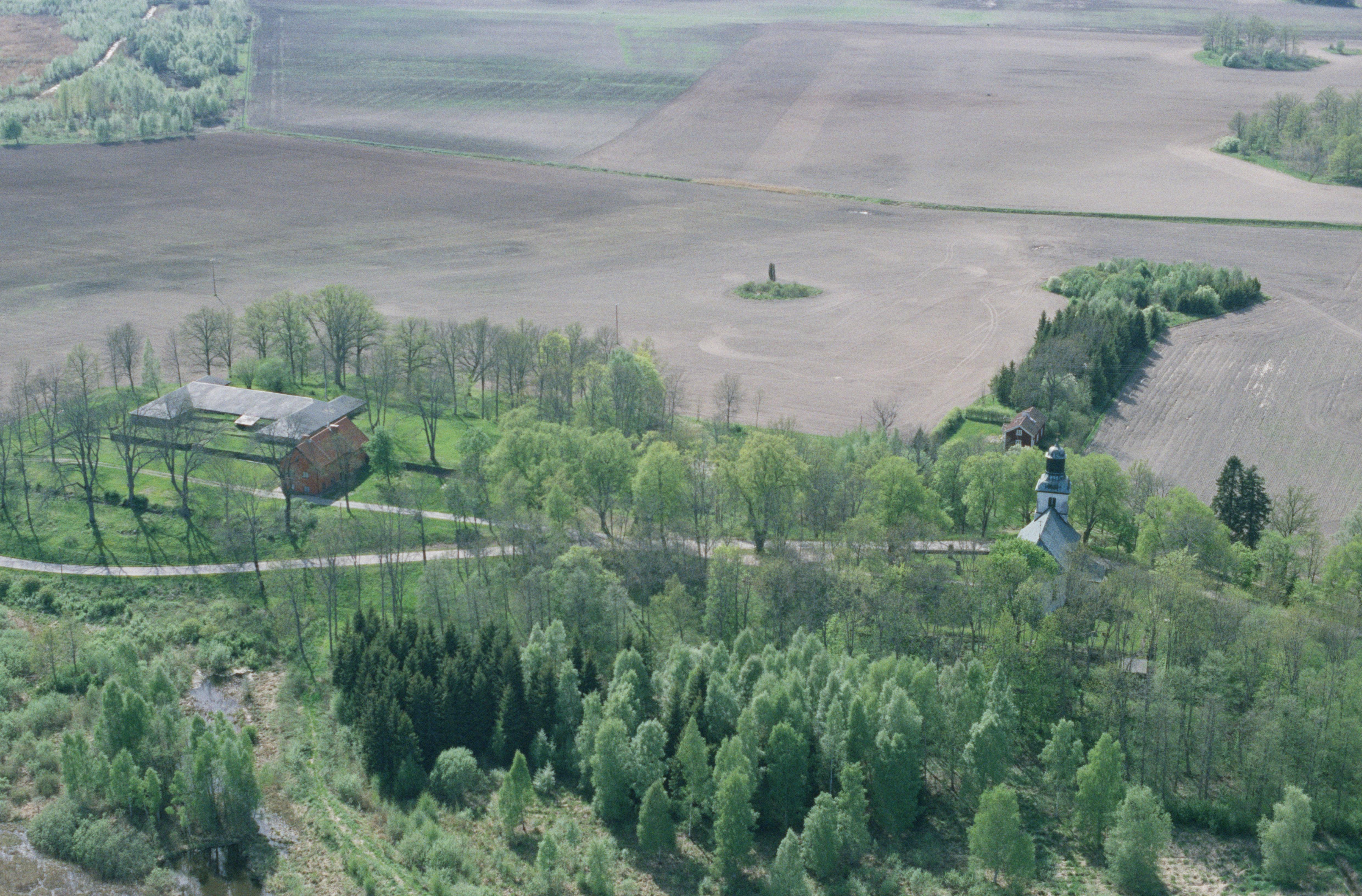 Beskrivning: Slottsruin Kägleholm RAÄnr Ödeby 8:1 (under grått skiffertak) och Ödeby kyrka vid sjön Väringen. Bilden är tagen mot (väderstreck): VSV