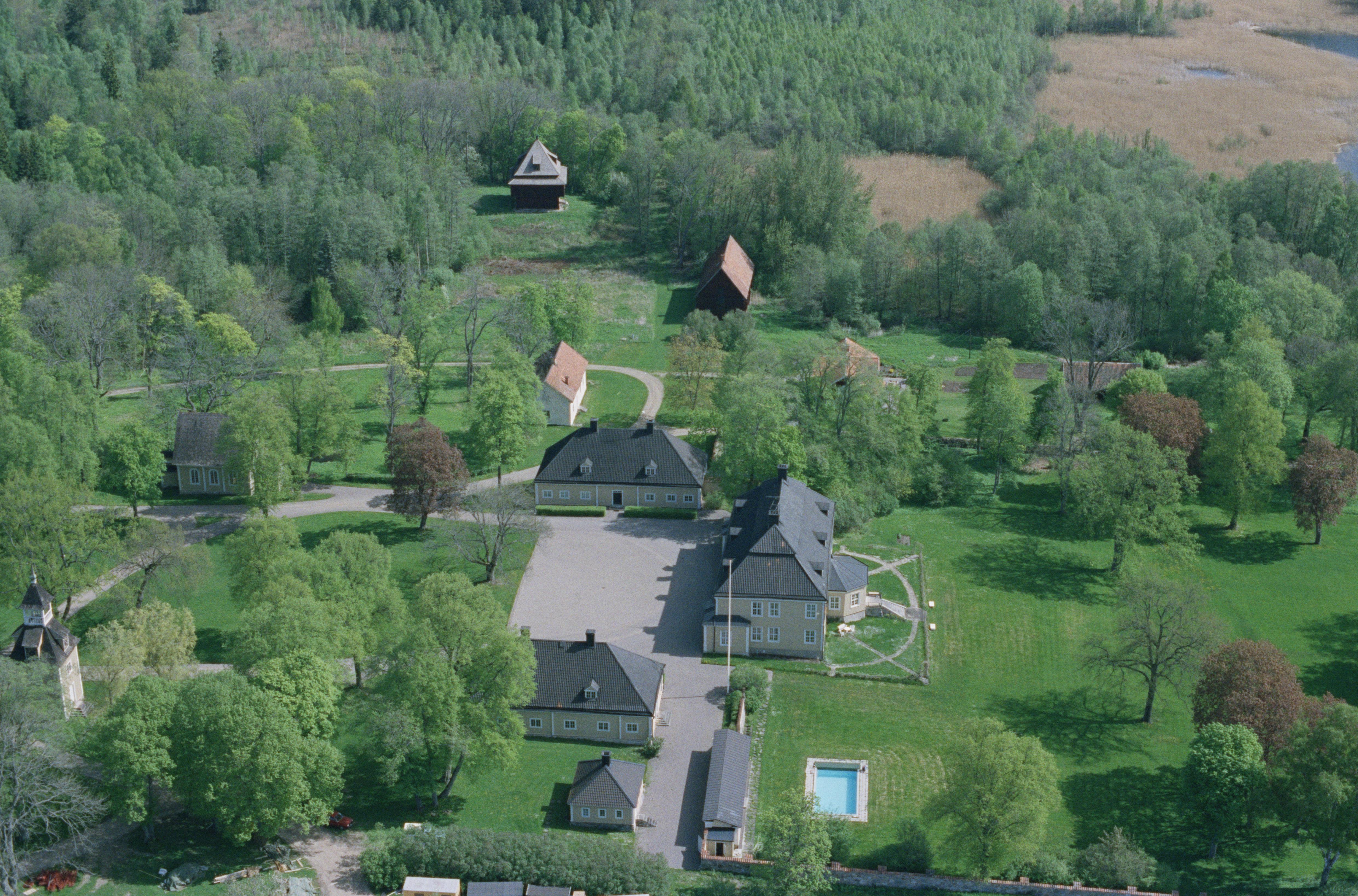 Beskrivning: Bystads herrgård fastighet Bystad 1:7. Fatbursbyggnad i bildens övre del. Bilden är tagen mot (väderstreck): ONO