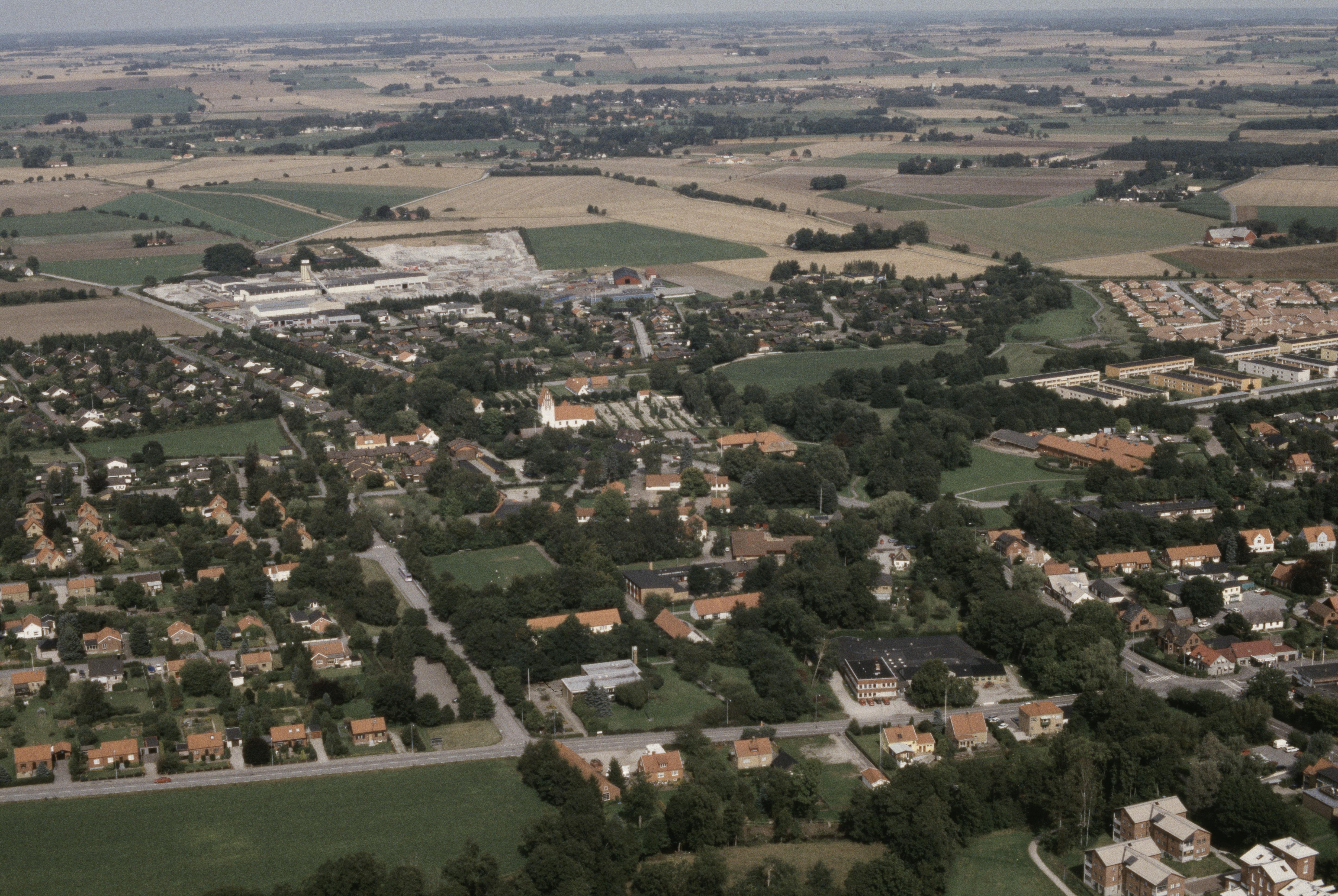 Beskrivning: Södra Sandby tätort. Södra Sandby kyrka till vänster. Bilden är tagen mot (väderstreck): NNO