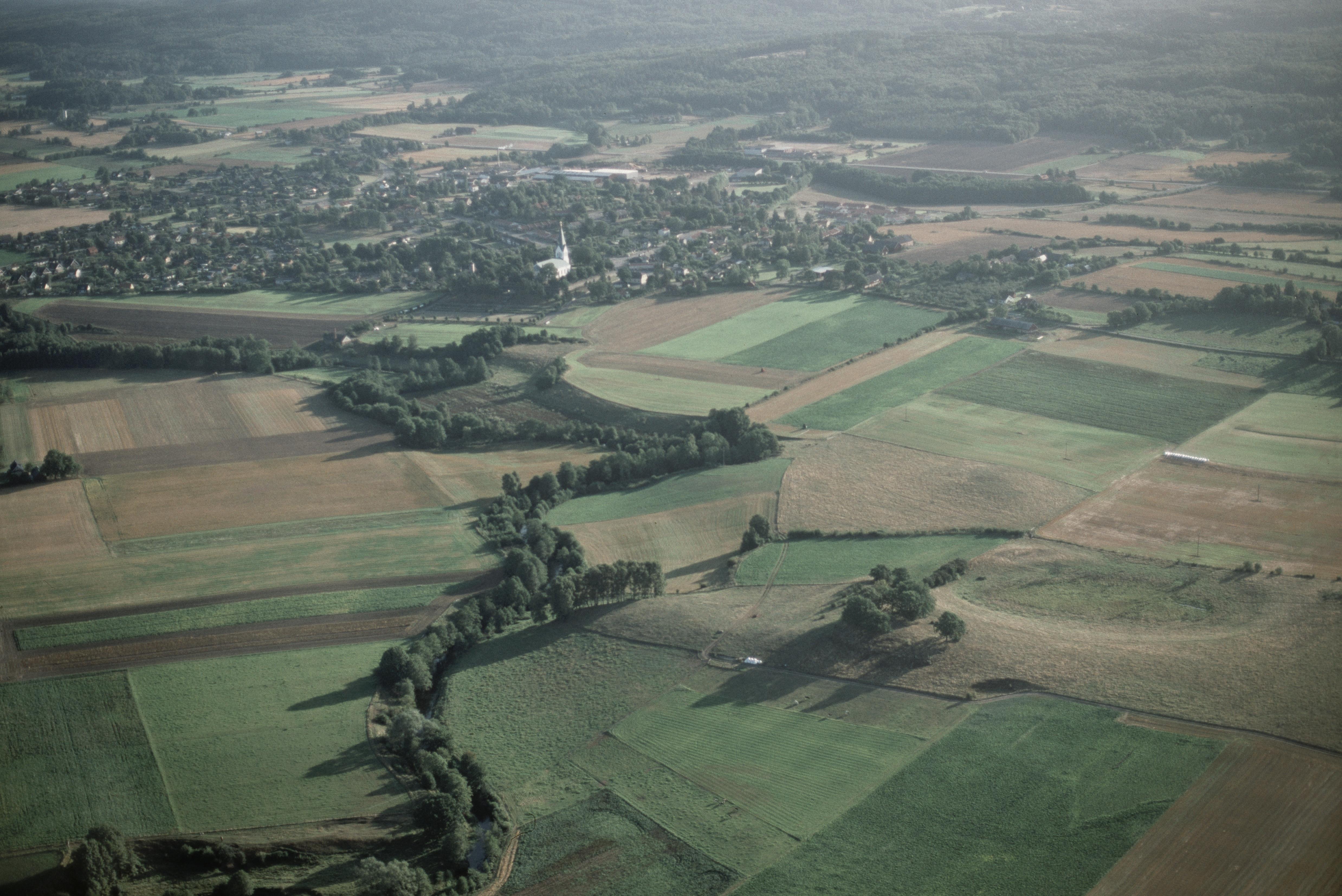 Beskrivning: Gravfält Näsums gudahage RAÄnr Näsum 5:1 vid Holjeån. I bildens övre del Näsums kyrka ock kyrkby. Bilden är tagen mot (väderstreck): NO
