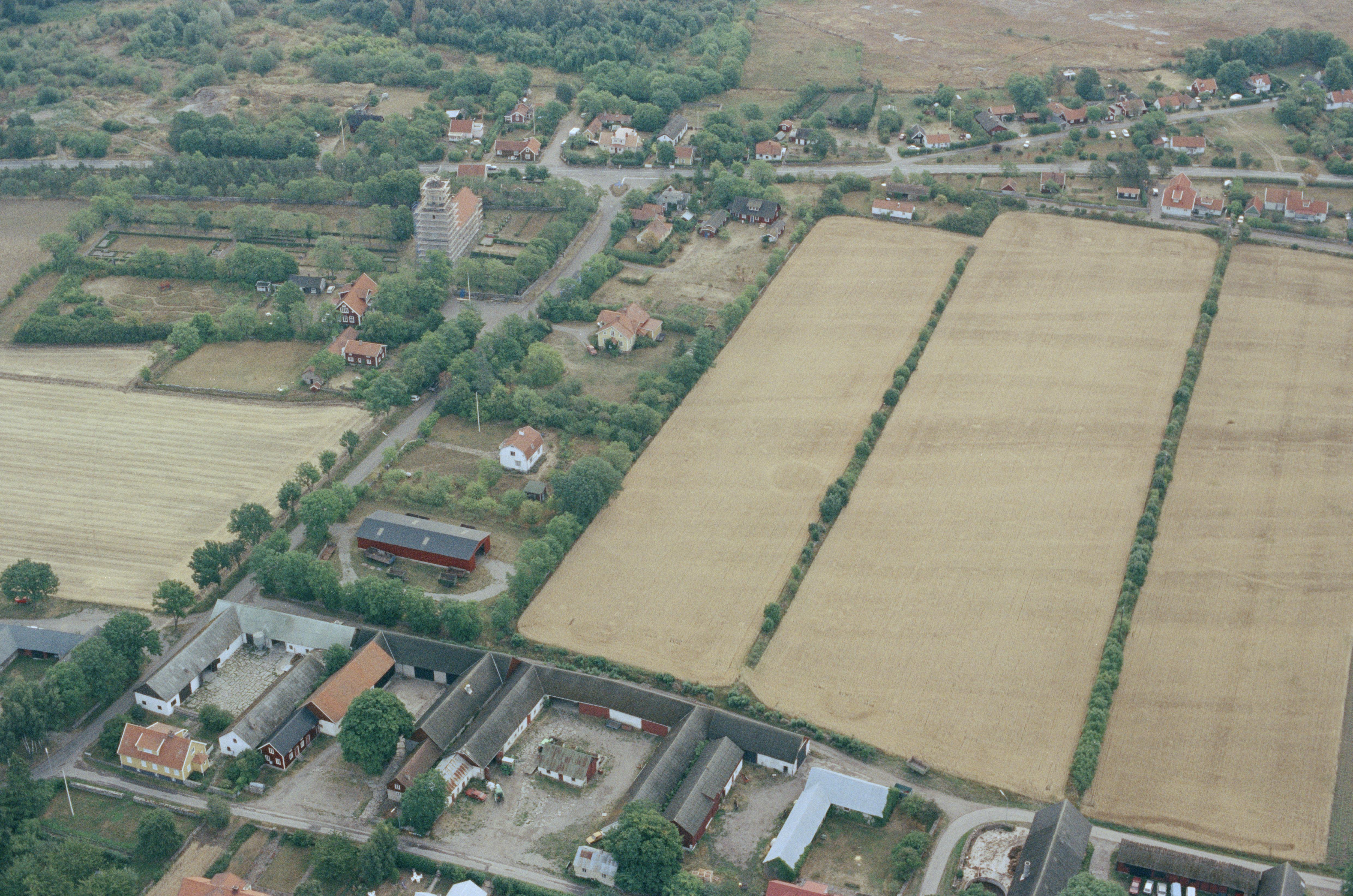 Beskrivning: Alvaret. Resmo kyrka och kyrkby. I bildens mitt cropmarks RAÄnr Resmo 154:1 i åker vid kyrkan. Bilden är tagen mot (väderstreck): SO
